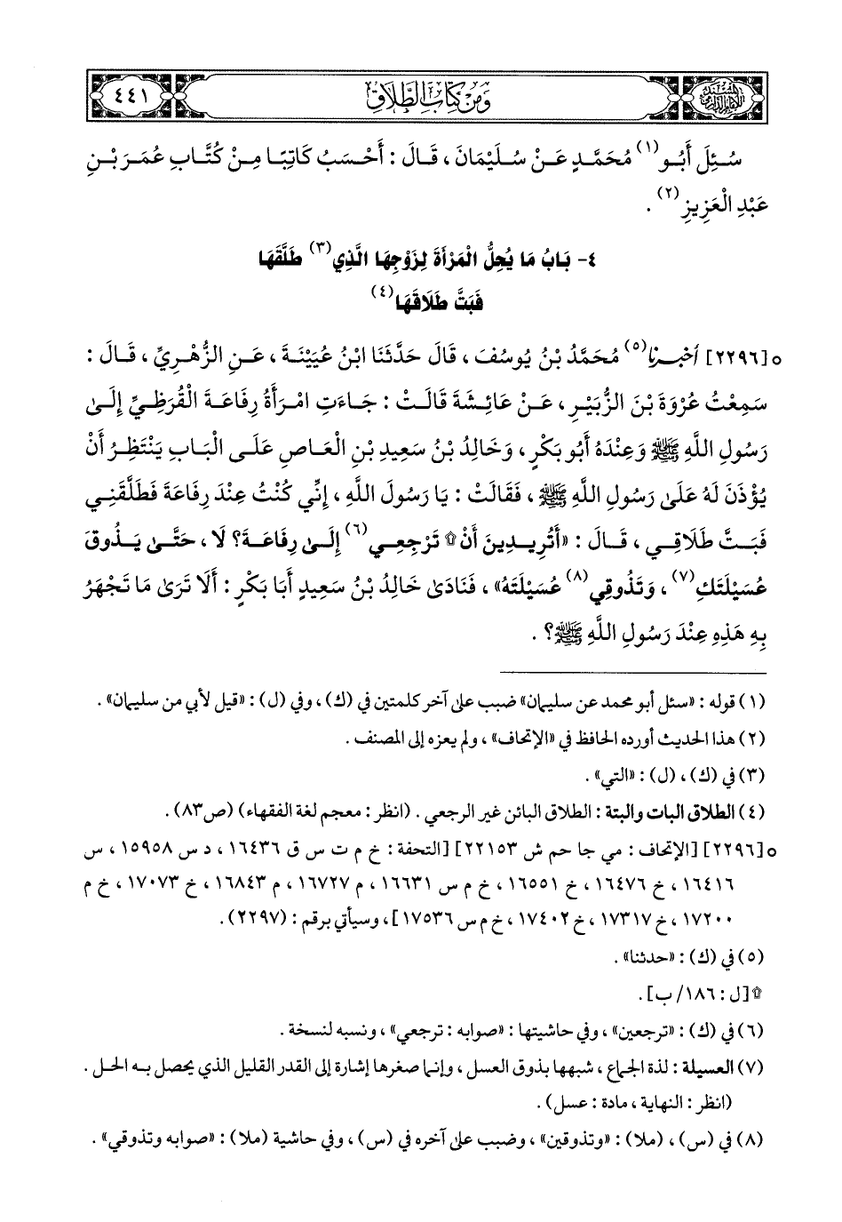 2296- أَخبَرَنا مُحَمَّدُ بْنُ يُوسُفَ, قَالَ: حَدَّثَنَا ابْنُ عُيَيْنَةَ, عَنِ الزُّهْرِيِّ, قَالَ: سَمِعْتُ عُرْوَةَ بْنَ الزُّبَيْرِ, عَنْ عَائِشَةَ قَالَتْ: جَاءَتِ امْرَأَةُ رِفَاعَةَ الْقُرَظِيِّ إِلَى رَسُولِ اللهِ صَلى الله عَليهِ وسَلم, وَعِنْدَهُ أَبُو بَكْرٍ, وَخَالِدُ بْنُ سَعِيدِ بْنِ الْعَاصِ عَلَى الْبَابِ يَنْتَظِرُ أَنْ يُؤْذَنَ لَهُ عَلَى رَسُولِ اللهِ صَلى الله عَليهِ وسَلم, فَقَالَتْ: يَا رَسُولَ اللهِ, إِنِّي كُنْتُ عِنْدَ رِفَاعَةَ, فَطَلَّقَنِي, فَبَتَّ طَلاَقِي, قَالَ: أَتُرِيدِينَ أَنْ تَرْجِعِي إِلَى رِفَاعَةَ؟ لاَ, حَتَّى يَذُوقَ عُسَيْلَتَكِ, وَتَذُوقِي عُسَيْلَتَهُ.