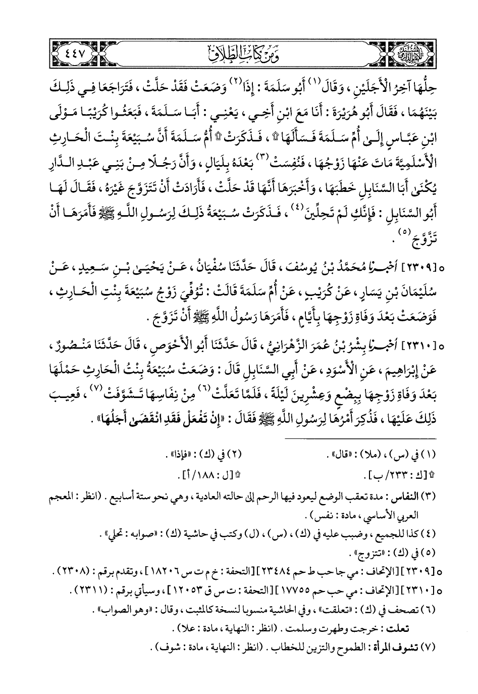 2310- أَخبَرَنا بِشْرُ بْنُ عُمَرَ الزَّهْرَانِيُّ, قَالَ: حَدَّثَنَا أَبُو الأَحْوَصِ, قَالَ: حَدَّثَنَا مَنْصُورٌ, عَنْ إِبْرَاهِيمَ, عَنِ الأَسْوَدِ, عَنْ أَبِي السَّنَابِلِ, قَالَ: وَضَعَتْ سُبَيْعَةُ بِنْتُ الْحَارِثِ حَمْلَهَا بَعْدَ وَفَاةِ زَوْجِهَا بِبِضْعٍ وَعِشْرِينَ لَيْلَةً, فَلَمَّا تَعَلَّتْ مِنْ نِفَاسِهَا, تَشَوَّفَتْ, فَعِيبَ ذَلِكَ عَلَيْهَا, فَذُكِرَ أَمْرُهَا لِرَسُولِ اللهِ صَلى الله عَليهِ وسَلم, فَقَالَ: إِنْ تَفْعَلْ فَقَدِ انْقَضَى أَجَلُهَا.