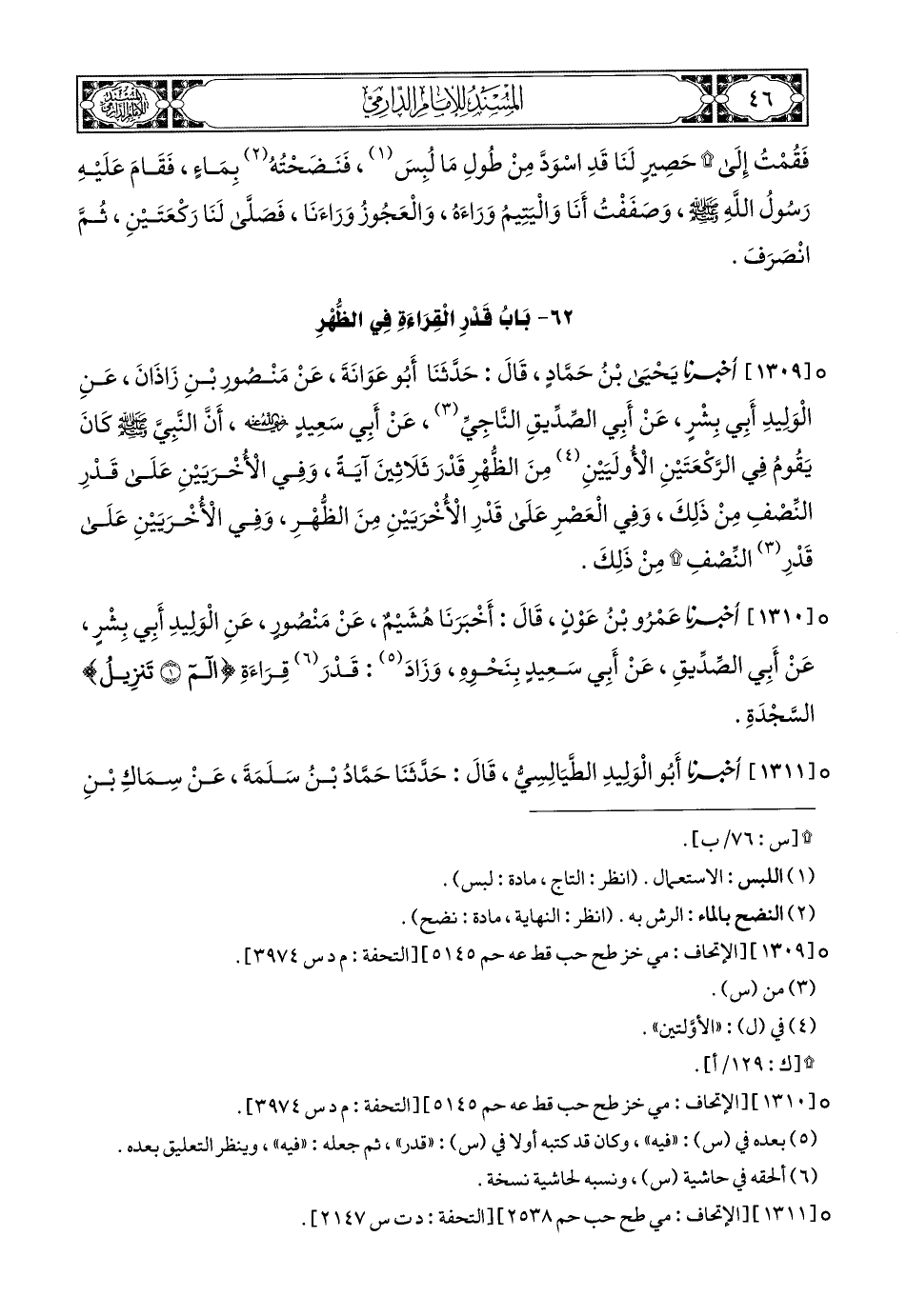 1309- أَخبَرَنا يَحْيَى بْنُ حَمَّادٍ, قَالَ: حَدَّثَنَا أَبُو عَوَانَةَ, عَنْ مَنْصُورِ بْنِ زَاذَانَ, عَنِ الْوَلِيدِ أَبِي بِشْرٍ, عَنْ أَبِي الصِّدِّيقِ النَّاجِيِّ (2), عَنْ أَبِي سَعِيدٍ رَضِيَ اللهُ عَنْهُ, أَنَّ النَّبِيَّ صَلى الله عَليهِ وسَلم كَانَ يَقُومُ فِي الرَّكْعَتَيْنِ الأُولَيَيْنِ مِنَ الظُّهْرِ قَدْرَ ثَلاَثِينَ آيَةً, وَفِي الأُخْرَيَيْنِ (3) عَلَى قَدْرِ النِّصْفِ مِنْ ذَلِكَ, وَفِي الْعَصْرِ عَلَى قَدْرِ الأُخْرَيَيْنِ مِنَ الظُّهْرِ, وَفِي الأُخْرَيَيْنِ عَلَى قَدْرِ النِّصْفِ (4) مِنْ ذَلِكَ.