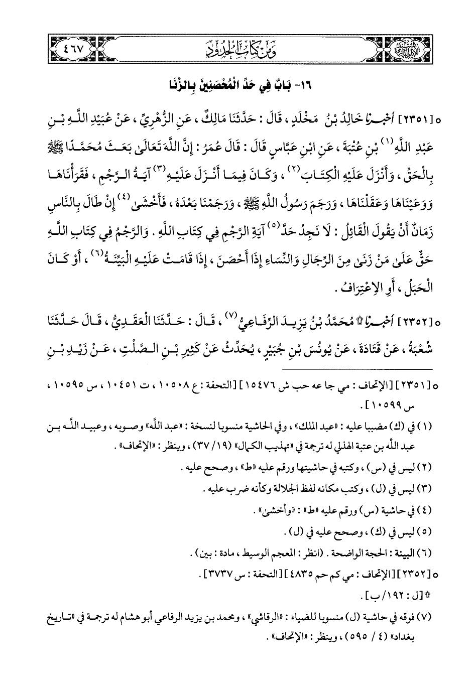 2351 - أَخبَرَنا خَالِدُ بْنُ مَخْلَدٍ, قَالَ: حَدَّثَنَا مَالِكٌ, عَنِ الزُّهْرِيِّ, عَنْ عُبَيْدِ اللهِ بْنِ عَبْدِ اللهِ بْنِ عُتْبَةَ, عَنِ ابْنِ عَبَّاسٍ, قَالَ: قَالَ عُمَرُ: إِنَّ اللهَ تَعَالَى بَعَثَ مُحَمَّدًا صَلى الله عَليهِ وسَلم بِالْحَقِّ, وَأَنْزَلَ عَلَيْهِ الْكِتَابَ, وَكَانَ فِيمَا أَنْزَلَ عَلَيْهِ (1) آيَةُ الرَّجْمِ, فَقَرَأْنَاهَا, وَوَعَيْنَاهَا وَعَقَلْنَاهَا, وَرَجَمَ رَسُولُ اللهِ صَلى الله عَليهِ وسَلم وَرَجَمْنَا بَعْدَهُ, فَأَخْشَى إِنْ طَالَ بِالنَّاسِ زَمَانٌ أَنْ يَقُولَ الْقَائِلُ لاَ نَجِدُ حَدَّ آيَةِ (2) الرَّجْمِ فِي كِتَابِ اللهِ, وَالرَّجْمُ فِي كِتَابِ اللهِ حَقٌّ عَلَى مَنْ زَنَى مِنَ الرِّجَالِ وَالنِّسَاءِ إِذَا أَحْصَنَ, إِذَا قَامَتْ عَلَيْهِ الْبَيِّنَةُ, أَوْ كَانَ الْحَبَلُ, أَوِ الاِعْتِرَافُ.