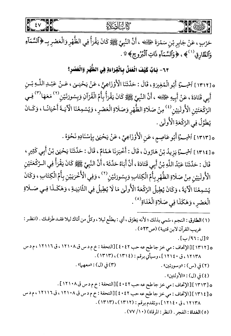 1312- أَخبَرَنا أَبُو الْمُغِيرَةِ, قَالَ: حَدَّثَنَا الأَوْزَاعِيُّ, عَنْ يَحْيَى, عَنْ عَبْدِ اللهِ بْنِ أَبِي قَتَادَةَ, عَنْ أَبِيهِ رَضِيَ اللهُ عَنْهُ؛ أَنَّ النَّبِيَّ صَلى الله عَليهِ وسَلم كَانَ يَقْرَأُ بِأُمِّ الْقُرْآنِ وَبِسُورَتَيْنِ مَعَهَا (1) فِي الرَّكْعَتَيْنِ الأُولَيَيْنِ مِنْ صَلاَةِ الظُّهْرِ, وَصَلاَةِ الْعَصْرِ, وَيُسْمِعُنَا الآيَةَ أَحْيَانًا, وَكَانَ يُطَوِّلُ فِي الرَّكْعَةِ الأُولَى.