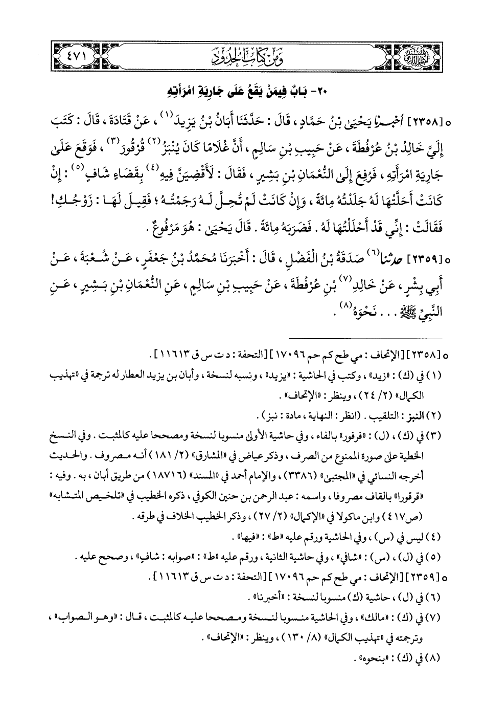 2358- أَخبَرَنا يَحْيَى بْنُ حَمَّادٍ, قَالَ: حَدَّثَنَا أَبَانُ بْنُ يَزِيدَ, عَنْ قَتَادَةَ, قَالَ: كَتَبَ إِلَيَّ خَالِدُ بْنُ عُرْفُطَةَ, عَنْ حَبِيبِ بْنِ سَالِمٍ؛ أَنَّ غُلاَمًا كَانَ يُنْبَزُ قُرْقُورَ (1), فَوَقَعَ عَلَى جَارِيَةِ امْرَأَتِهِ, فَرُفِعَ إِلَى النُّعْمَانِ بْنِ بَشِيرٍ, فَقَالَ: لأَقْضِيَنَّ فِيهِ بِقَضَاءٍ شَافٍ؛ إِنْ كَانَتْ أَحَلَّتْهَا لَهُ جَلَدْتُهُ مِئَةً, وَإِنْ كَانَتْ لَمْ تُحِلَّ (2) لَهُ رَجَمْتُهُ, فَقِيلَ لَهَا: زَوْجُكِ! فَقَالَتْ: إِنِّي قَدْ أَحْلَلْتُهَا لَهُ, فَضَرَبَهُ مِئَةً.