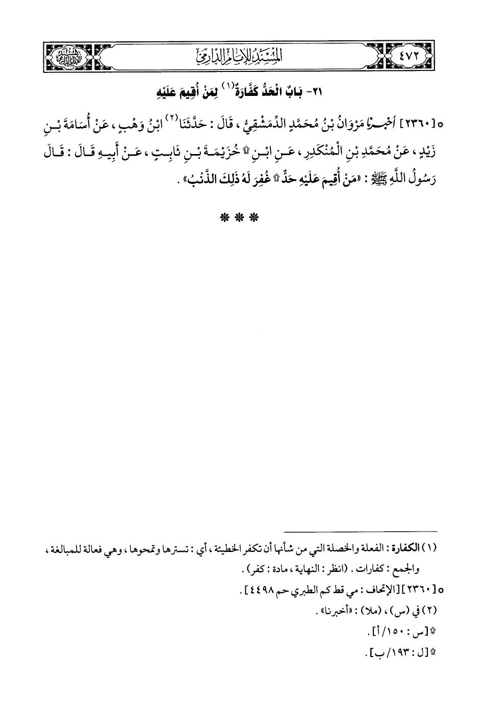2360- أَخبَرَنا مَرْوَانُ بْنُ مُحَمَّدٍ الدِّمَشْقِيُّ, قَالَ: حَدَّثَنَا ابْنُ وَهْبٍ, عَنْ أُسَامَةَ بْنِ زَيْدٍ, عَنْ مُحَمَّدِ بْنِ الْمُنْكَدِرِ, عَنِ ابْنِ خُزَيْمَةَ بْنِ ثَابِتٍ, عَنْ أَبِيهِ, قَالَ: قَالَ رَسُولُ اللهِ صَلى الله عَليهِ وسَلم: مَنْ أُقِيمَ عَلَيْهِ حَدٌّ, غُفِرَ لَهُ ذَلِكَ الذَّنْبُ.