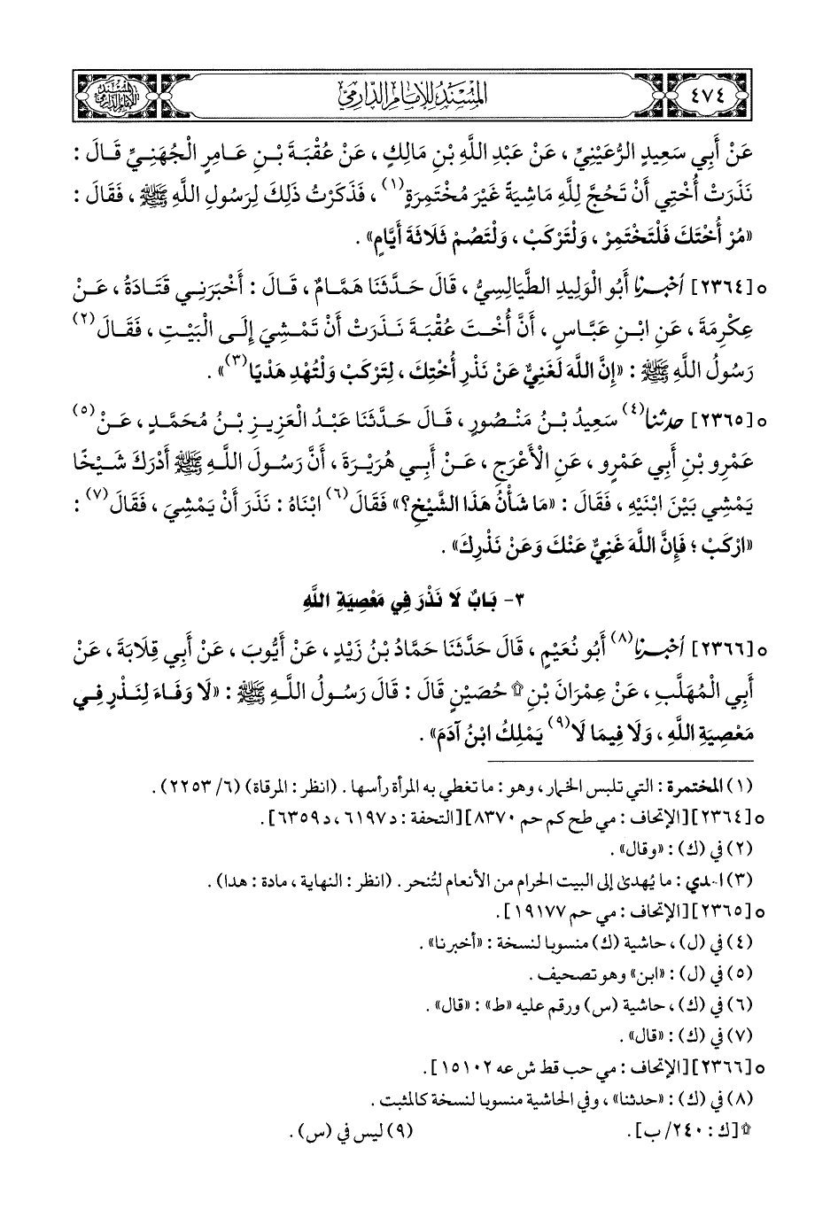 2366- أَخبَرَنا أَبُو نُعَيْمٍ, قَالَ: حَدَّثَنَا حَمَّادُ بْنُ زَيْدٍ, عَنْ أَيُّوبَ, عَنْ أَبِي قِلاَبَةَ, عَنْ أَبِي الْمُهَلَّبِ, عَنْ عِمْرَانَ بْنِ حُصَيْنٍ, قَالَ: قَالَ رَسُولُ اللهِ صَلى الله عَليهِ وسَلم: لاَ وَفَاءَ لِنَذْرٍ فِي مَعْصِيَةِ اللهِ, وَلاَ فِيمَا لاَ يَمْلِكُ ابْنُ آدَمَ.