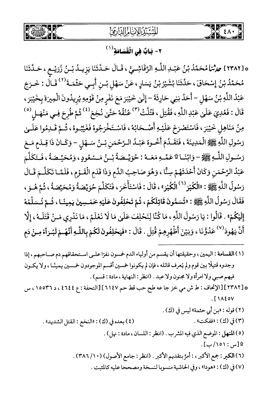 2382- حَدَّثَنَا مُحَمَّدُ بْنُ عَبْدُ اللهِ الرَّقَاشِيُّ, قَالَ: حَدَّثَنَا يَزِيدُ بْنُ زُرَيْعٍ, حَدَّثَنَا مُحَمَّدُ بْنُ إِسْحَاقَ, حَدَّثَنَا بُشَيْرُ بْنُ يَسَارٍ, عَنْ سَهْلِ بْنِ أَبِي حَثْمَةَ, قَالَ: خَرَجَ عَبْدُ اللهِ بْنُ سَهْلٍ, أَحَدُ بَنِي حَارِثَةَ إِلَى خَيْبَرَ مَعَ نَفَرٍ مِنْ قَوْمِهِ, يُرِيدُونَ الْمِيرَةَ بِخَيْبَرَ, قَالَ: فَعُدِيَ عَلَى عَبْدِ اللهِ, فَقُتِلَ, فَتُلَّتْ عُنُقُهُ, حَتَّى نُخِعَ, ثُمَّ طُرِحَ فِي مَنْهَلٍ مِنْ مَنَاهِلِ خَيْبَرَ, فَاسْتَصْرَخَ عَلَيْهِ أَصْحَابُهُ, فَاسْتَخْرَجُوهُ, فَغَيَّبُوهُ, ثُمَّ قَدِمُوا عَلَى رَسُولِ اللهِ صَلى الله عَليهِ وسَلم الْمَدِينَةَ, فَتَقَدَّمَ أَخُوهُ عَبْدُ الرَّحْمَنِ بْنُ سَهْلٍ, وَكَانَ ذَا قِدَمٍ مَعَ رَسُولِ اللهِ صَلى الله عَليهِ وسَلم, وَابْنَا عَمِّهِ مَعَهُ: حُوَيِّصَةُ بْنُ مَسْعُودٍ, وَمُحَيِّصَةُ, فَتَكَلَّمَ عَبْدُ الرَّحْمَنِ, وَكَانَ أَحْدَثَهُمْ سِنًّا, وَهُوَ صَاحِبُ الدَّمِ, وَذَا قَدَمِ الْقَوْمِ, فَلَمَّا تَكَلَّمَ, قَالَ رَسُولُ اللهِ صَلى الله عَليهِ وسَلم: الْكُبْرَ الْكُبْرَ, قَالَ: فَاسْتَأْخَرَ, فَتَكَلَّمَ حُوَيِّصَةُ وَمُحَيِّصَةُ, ثُمَّ هُوَ, فَقَالَ رَسُولُ اللهِ صَلى الله عَليهِ وسَلم: تُسَمُّونَ قَاتِلَكُمْ, ثُمَّ تَحْلِفُونَ عَلَيْهِ خَمْسِينَ يَمِينًا, ثُمَّ نُسَلِّمُهُ إِلَيْكُمْ, قَالُوا: يَا رَسُولَ اللهِ, مَا كُنَّا لِنَحْلِفَ عَلَى مَا لاَ نَعْلَمُ, مَا نَدْرِي مَنْ قَتَلَهُ, إِلاَّ أَنَّ يَهُودَ عَدُوُّنَا, وَبَيْنَ أَظْهُرِهِمْ قُتِلَ, قَالَ: فَيَحْلِفُونَ لَكُمْ بِاللهِ أَنَّهُمْ لَبُرَآءُ مِنْ دَمِ صَاحِبِكُمْ, ثُمَّ يَبْرَؤُونَ مِنْهُ, قَالُوا: مَا كُنَّا لِنَقْبَلَ أَيْمَانَ يَهُودَ, مَا فِيهِمْ أَكْبَرُ (1) مِنْ أَنْ يَحْلِفُوا عَلَى إِثْمٍ, قَالَ: فَوَدَاهُ رَسُولُ اللهِ صَلى الله عَليهِ وسَلم مِنْ عِنْدِهِ بِمِئَةِ نَاقَةٍ.