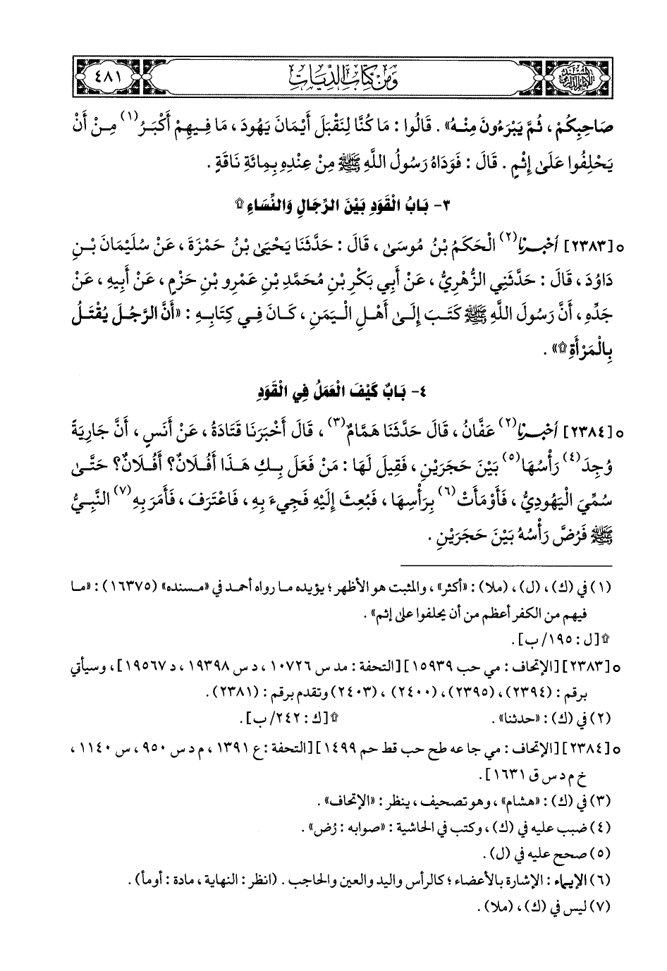 2384- أَخبَرَنا عَفَّانُ, قَالَ: حَدَّثَنَا هَمَّامٌ, قَالَ: أَخبَرَنا قَتَادَةُ, عَنْ أَنَسٍ, أَنَّ جَارِيَةً وُجِدَ رَأْسُهَا (1) بَيْنَ حَجَرَيْنِ, فَقِيلَ لَهَا: مَنْ فَعَلَ بِكِ هَذَا, أَفَلاَنٌ؟ أَفُلاَنٌ؟ حَتَّى سُمِّيَ الْيَهُودِيُّ, فَأَوْمَأَتْ بِرَأْسِهَا, فَبُعِثَ إِلَيْهِ, فَجِيءَ بِهِ, فَاعْتَرَفَ, فَأَمَرَ بِهِ النَّبِيُّ صَلى الله عَليهِ وسَلم فَرُضَّ رَأْسُهُ بَيْنَ حَجَرَيْنِ.