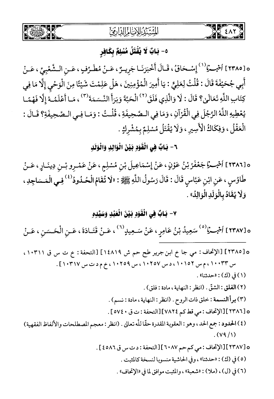 2385 - أَخبَرَنا إِسْحَاقُ, قَالَ: أَخبَرَنا جَرِيرٌ, عَنْ مُطَرِّفٍ, عَنِ الشَّعْبِيِّ, عَنْ أَبِي جُحَيْفَةَ, قَالَ: قُلْتُ لِعَلِيٍّ: يَا أَمِيرَ الْمُؤْمِنِينَ, هَلْ عَلِمْتَ شَيْئًا مِنَ الْوَحْيِ, إِلاَّ مَا فِي كِتَابِ اللهِ تَعَالَى؟ قَالَ: لاَ وَالَّذِي فَلَقَ الْحَبَّةَ, وَبَرَأَ النَّسَمَةَ مَا أَعْلَمُهُ إِلاَّ فَهْمًا يُعْطِيهِ اللهُ الرَّجُلَ فِي الْقُرْآنِ وَمَا فِي الصَّحِيفَةِ, قُلْتُ: وَمَا فِي الصَّحِيفَةِ؟ قَالَ: الْعَقْلُ, وَفِكَاكُ الأَسِيرِ, وَلا يُقْتَلُ مُسْلِمٌ بِمُشْرِكٍ.