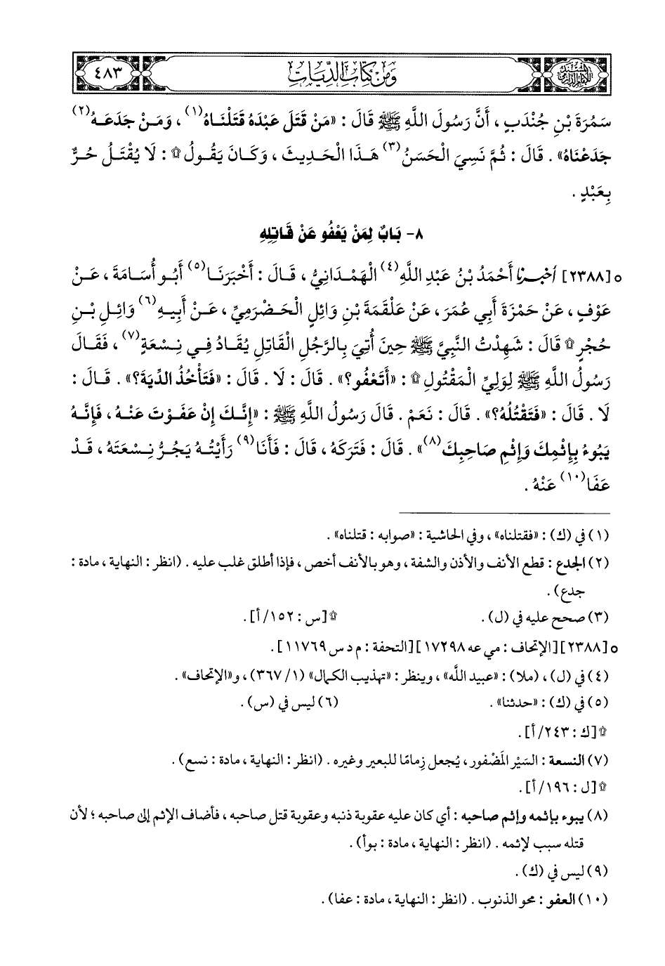 2388- أَخبَرَنا أَحْمَدُ بْنُ عَبْدِ اللهِ الْهَمْدَانِيُّ (1), قَالَ: أَخبَرَنا أَبُو أُسَامَةَ, عَنْ عَوْفٍ, عَنْ حَمْزَةَ أَبِي عُمَرَ (2), عَنْ عَلْقَمَةَ بْنِ وَائِلٍ الْحَضْرَمِيِّ, عَنْ أَبِيهِ وَائِلِ بْنِ حُجْرٍ, قَالَ: شَهِدْتُ النَّبِيَّ صَلى الله عَليهِ وسَلم حِينَ أُتِيَ بِالرَّجُلِ الْقَاتِلِ يُقَادُ فِي نِسْعَةٍ, فَقَالَ رَسُولُ اللهِ صَلى الله عَليهِ وسَلم لِوَلِيِّ الْمَقْتُولِ: أَتَعْفُو؟ قَالَ: لاَ, قَالَ: فَتَأْخُذُ الدِّيَةَ؟ قَالَ: لاَ, قَالَ: فَتَقْتُلُهُ؟ قَالَ: نَعَمْ, قَالَ رَسُولُ اللهِ صَلى الله عَليهِ وسَلم: إِنَّكَ إِنْ عَفَوْتَ عَنْهُ, فَإِنَّهُ يَبُوءُ بِإِثْمِكَ وَإِثْمِ صَاحِبِكَ, قَالَ: فَتَرَكَهُ.
