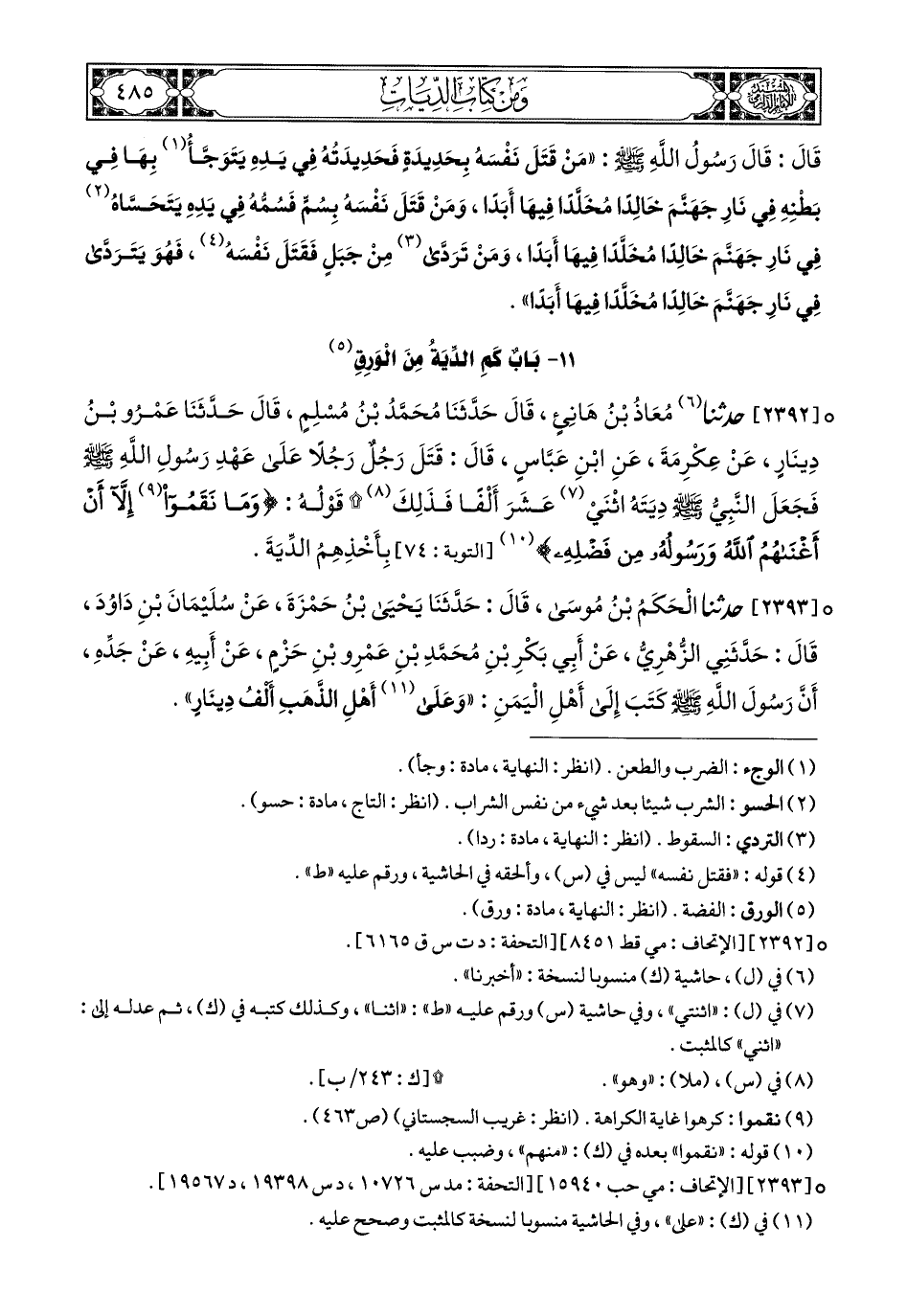 2392- حَدَّثَنَا مُعَاذُ بْنُ هَانِئٍ, قَالَ: حَدَّثَنَا مُحَمَّدُ بْنُ مُسْلِمٍ, قَالَ: حَدَّثَنَا عَمْرُو بْنُ دِينَارٍ, عَنْ عِكْرِمَةَ, عَنِ ابْنِ عَبَّاسٍ, قَالَ: قَتَلَ رَجُلٌ رَجُلاً عَلَى عَهْدِ رَسُولِ اللهِ صَلى الله عَليهِ وسَلم, فَجَعَلَ النَّبِيُّ صَلى الله عَليهِ وسَلم دِيَتَهُ اثْنَيْ عَشَرَ أَلْفًا, فَذَلِكَ (1) قَوْلُهُ: {وَمَا نَقَمُوا إِلاَّ أَنْ أَغْنَاهُمُ اللهُ وَرَسُولُهُ مِن فَضْلِهِ} (2) بِأَخْذِهِمُ الدِّيَةَ.