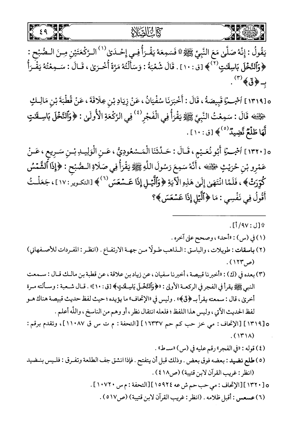 1319- أَخبَرَنا قَبِيصَةُ, قَالَ: أَخبَرَنا سُفْيَانُ, عَنْ زِيَادِ بْنِ عِلاَقَةَ, عَنْ قُطْبَةَ بْنِ مَالِكٍ رَضِيَ اللهُ عَنْهُ, قَالَ: سَمِعْتُ النَّبِيَّ صَلى الله عَليهِ وسَلم يَقْرَأُ فِي الْفَجْرِ فِي الرَّكْعَةِ الأُولَى {وَالنَّخْلَ بَاسِقَاتٍ لَهَا طَلْعٌ نَضِيدٌ}.