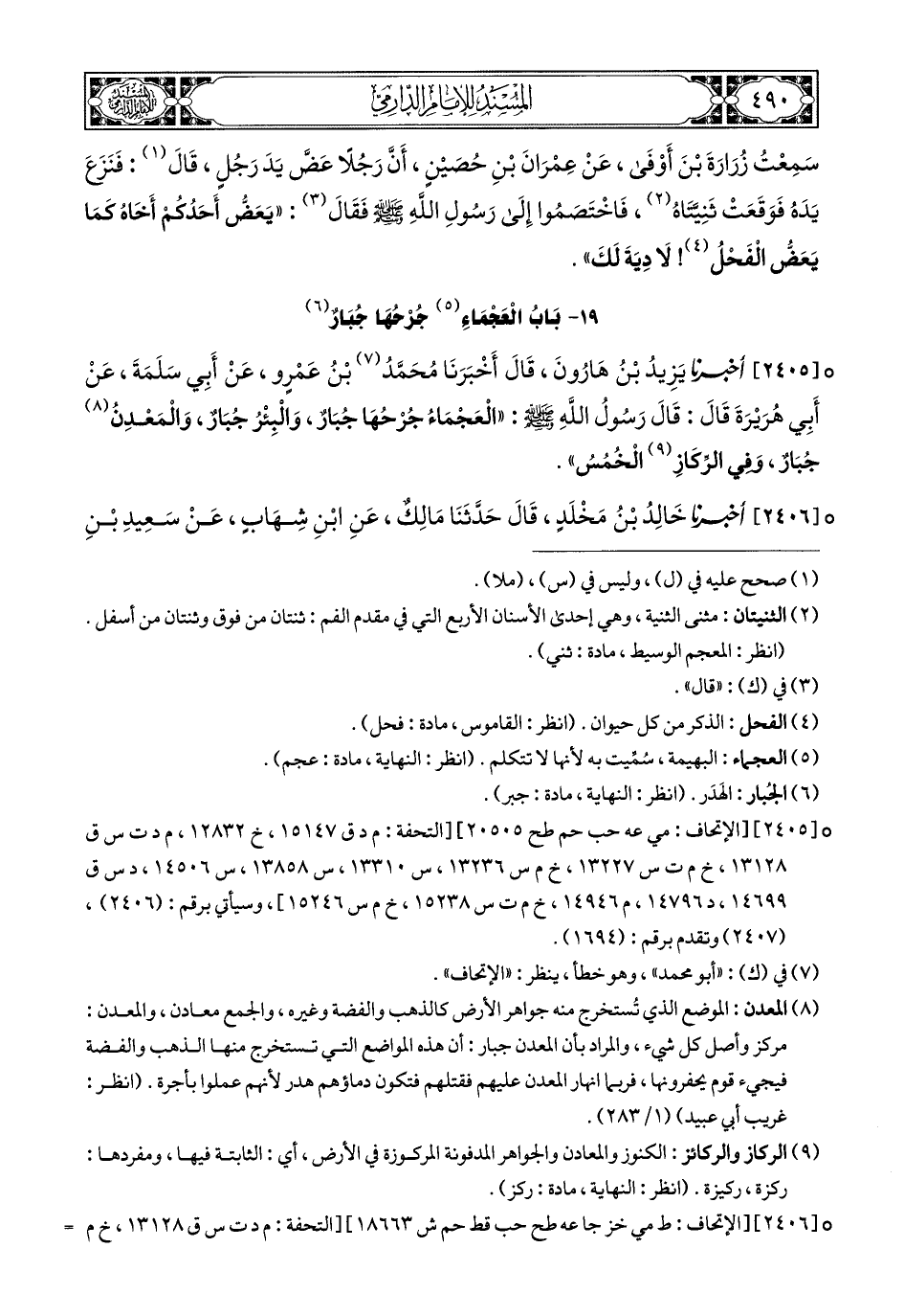 2406- أَخبَرَنا خَالِدُ بْنُ مَخْلَدٍ, قَالَ: حَدَّثَنَا مَالِكٌ, عَنِ ابْنِ شِهَابٍ, عَنْ سَعِيدِ بْنِ الْمُسَيَّبِ, وَأَبِي سَلَمَةَ, عَنْ أَبِي هُرَيْرَةَ, عَنِ النَّبِيِّ صَلى الله عَليهِ وسَلم, قَالَ: جُرْحُ الْعَجْمَاءِ جُبَارٌ, وَالْبِئْرُ جُبَارٌ, وَالْمَعْدِنُ جُبَارٌ, وَفِي الرِّكَازِ الْخُمُسُ.