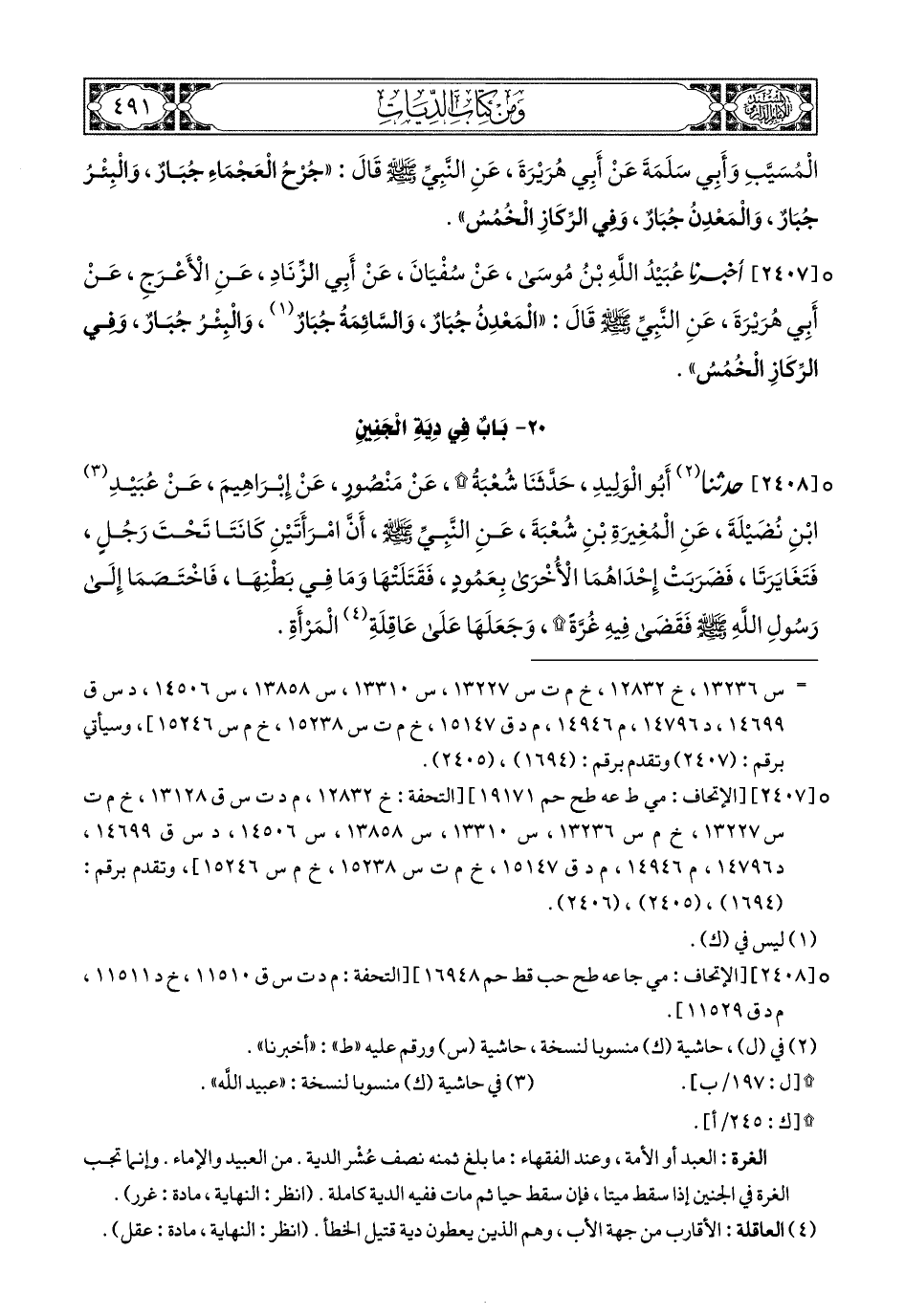 2408- حَدَّثَنَا أَبُو الْوَلِيدِ, حَدَّثَنَا شُعْبَةُ, عَنْ مَنْصُورٍ, عَنْ إِبْرَاهيِمَ, عَنْ عُبَيْدِ بْنِ نُضَيْلَةَ (1), عَنِ الْمُغِيرَةِ بْنِ شُعْبَةَ, عَنِ النَّبِيِّ صَلى الله عَليهِ وسَلم, أَنَّ امْرَأَتَيْنِ كَانَتَا تَحْتَ رَجُلٍ, فَتَغَايَرَتَا, فَضَرَبَتْ إِحْدَاهُمَا الأُخْرَى بِعَمُودٍ, فَقَتَلَتْهَا وَمَا فِي بَطْنِهَا, فَاخْتَصَمَا إِلَى رَسُولِ اللهِ صَلى الله عَليهِ وسَلم, فَقَضَى فِيهِ غُرَّةً, وَجَعَلَهَا عَلَى عَاقِلَةِ الْمَرْأَةِ.