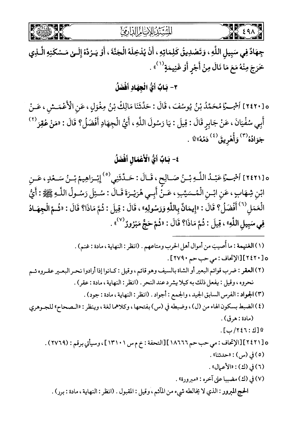 2421- أَخبَرَنا عَبْدُ اللهِ بْنُ صَالِحٍ, قَالَ: حَدَّثَنِي إِبْرَاهِيمُ بْنُ سَعْدٍ, عَنِ ابْنِ شِهَابٍ, عَنِ ابْنِ الْمُسَيَّبِ, عَنْ أَبِي هُرَيْرَةَ, قَالَ: سُئِلَ (1) رَسُولُ اللهِ صَلى الله عَليهِ وسَلم: أَيُّ الْعَمَلِ (2) أَفْضَلُ؟ قَالَ: إِيمَانٌ بِاللهِ وَرَسُولِهِ, قَالَ: قِيلَ: ثُمَّ مَاذَا؟ قَالَ: ثُمَّ الْجِهَادُ فِي سَبِيلِ اللهِ, قِيلَ: ثُمَّ مَاذَا؟ قَالَ: ثُمَّ حَجٌّ مَبْرُورٌ.