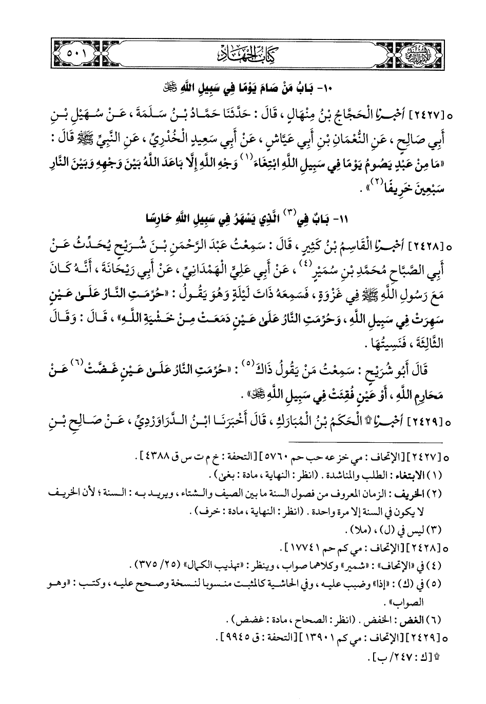 2428- أَخبَرَنا الْقَاسِمُ بْنُ كَثِيرٍ, قَالَ: سَمِعْتُ عَبْدَ الرَّحْمَنِ بْنَ شُرَيْحٍ يُحَدِّثُ, عَنْ أَبِي الصَّبَّاحِ مُحَمَّدِ بْنِ سُمَيْرٍ (2), عَنْ أَبِي عَلِيٍّ الْهَمْدَانِيِّ, عَنْ أَبِي رَيْحَانَةَ, أَنَّهُ كَانَ مَعَ رَسُولِ اللهِ صَلى الله عَليهِ وسَلم فِي غَزْوَةٍ, فَسَمِعَهُ ذَاتَ لَيْلَةٍ وَهُوَ يَقُولُ: حُرِّمَتِ النَّارُ عَلَى عَيْنٍ سَهِرَتْ فِي سَبِيلِ اللهِ, وَحُرِّمَتِ النَّارُ عَلَى عَيْنٍ دَمَعَتْ مِنْ خَشْيَةِ اللهِ, قَالَ: وَقَالَ الثَّالِثَةَ فَنَسِيتُهَا.