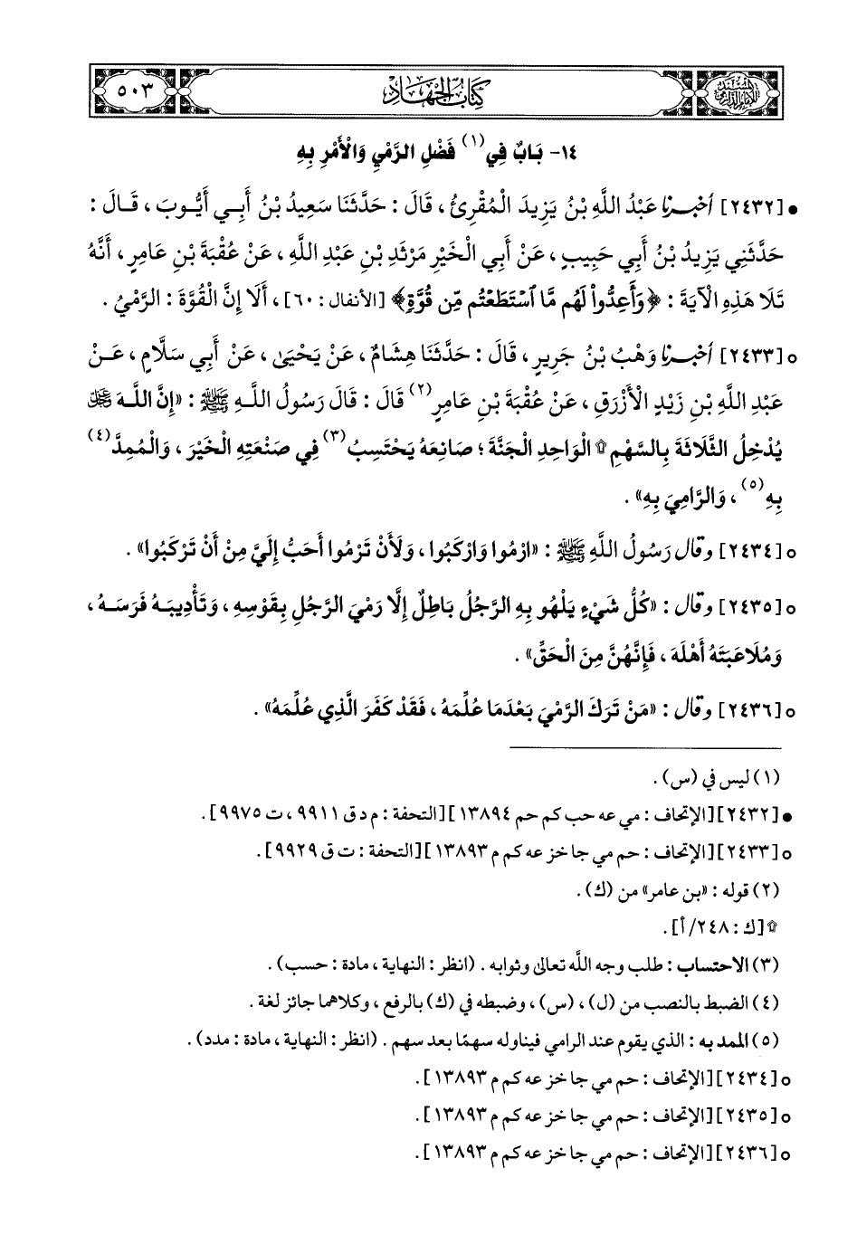 2436- وَقَالَ (1): مَنْ تَرَكَ الرَّمْيَ بَعْدَ مَا عُلِّمَهُ, فَقَدْ كَفَرَ الَّذِي عُلِّمَهُ.