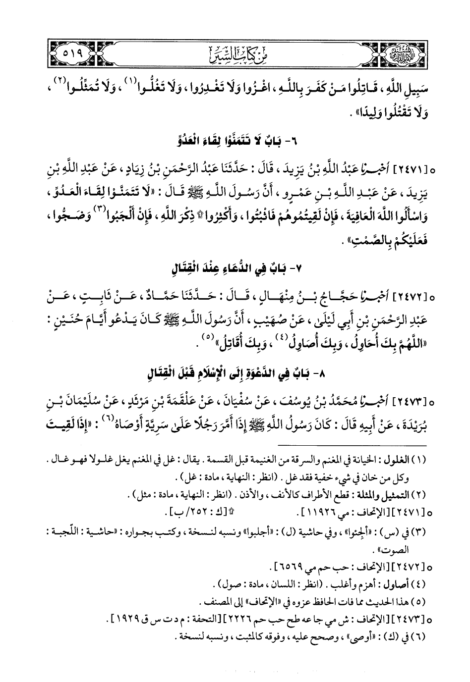 2472- أَخبَرَنا حَجَّاجُ بْنُ مِنْهَالٍ, قَالَ: حَدَّثَنَا حَمَّادٌ, عَنْ ثَابِتٍ, عَنْ عَبْدِ الرَّحْمَنِ بْنِ أَبِي لَيْلَى, عَنْ صُهَيْبٍ, أَنَّ رَسُولَ اللهِ صَلى الله عَليهِ وسَلم كَانَ يَدْعُو أَيَّامَ حُنَيْنٍ: اللهُمَّ بِكَ أُحَاوِلُ, وَبِكَ أُصَاوِلُ, وَبِكَ أُقَاتِلُ(1).