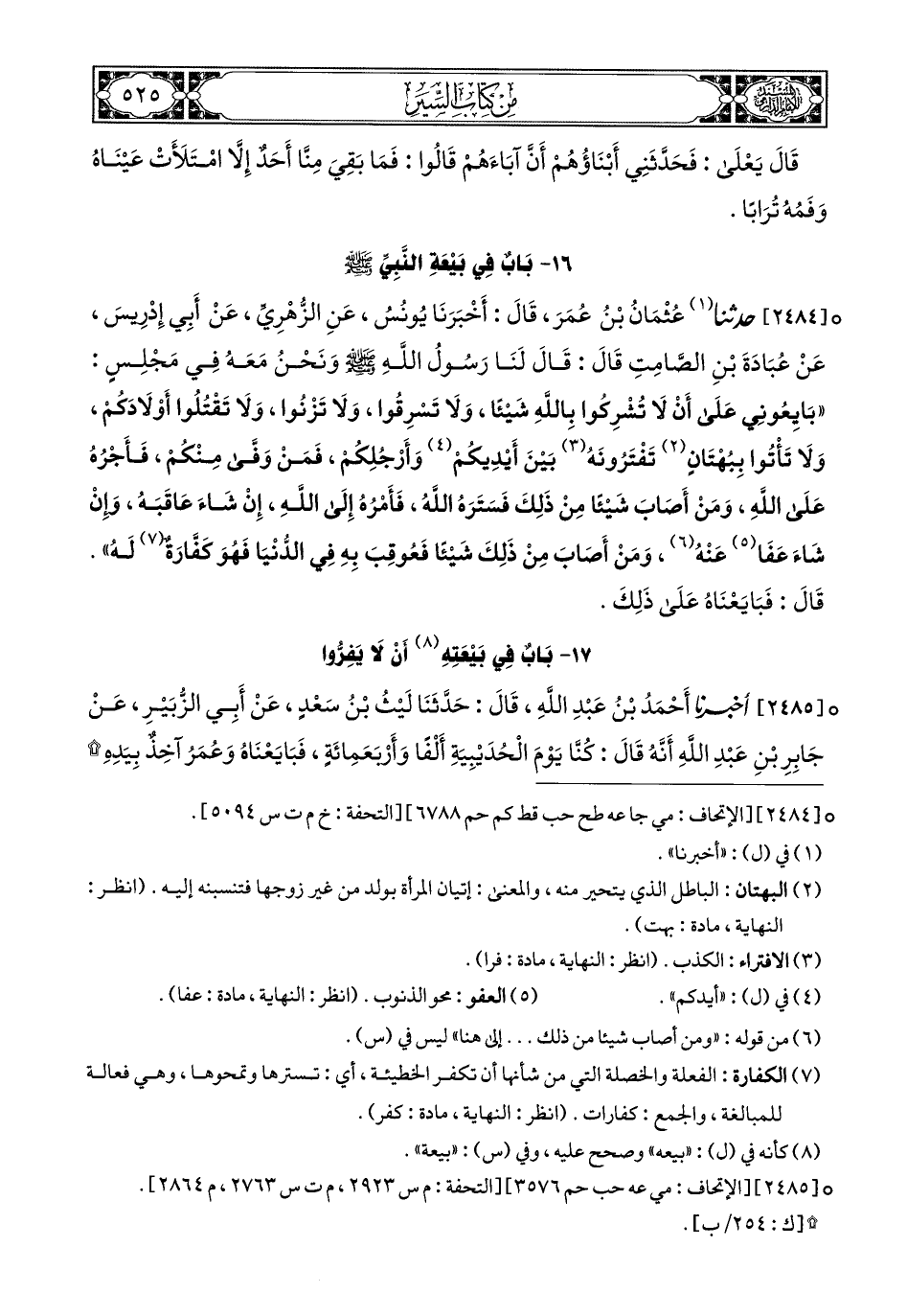 2484- حَدَّثَنَا عُثْمَانُ بْنُ عُمَرَ, قَالَ: أَخبَرَنا يُونُسُ, عَنِ الزُّهْرِيِّ, عَنْ أَبِي إِدْرِيسَ, عَنْ عُبَادَةَ بْنِ الصَّامِتِ, قَالَ: قَالَ لَنَا رَسُولُ اللهِ صَلى الله عَليهِ وسَلم وَنَحْنُ مَعَهُ فِي مَجْلِسٍ: بَايِعُونِي عَلَى أَنْ لاَ تُشْرِكُوا بِاللهِ شَيْئًا, وَلاَ تَسْرِقُوا, وَلاَ تَزْنُوا, وَلاَ تَقْتُلُوا أَوْلاَدَكُمْ, وَلاَ تَأْتُوا بِبُهْتَانٍ تَفْتَرُونَهُ بَيْنَ أَيْدِيكُمْ وَأَرْجُلِكُمْ, فَمَنْ وَفَّى مِنْكُمْ, فَأَجْرُهُ عَلَى اللهِ, وَمَنْ أَصَابَ شَيْئًا مِنْ ذَلِكَ فَسَتَرَهُ اللهُ, فَأَمْرُهُ إِلِي اللهِ, إِنْ شَاءَ عَاقَبَهُ, وَإِنْ شَاءَ عَفَا عَنْهُ, وَمَنْ أَصَابَ مِنْ ذَلِكَ (1) شَيْئًا, فَعُوقِبَ بِهِ فِي الدُّنْيَا, فَهُوَ كَفَّارَةٌ لَهُ.
