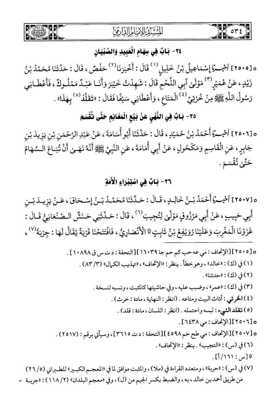 2506- أَخبَرَنا أَحْمَدُ بْنُ حُمَيْدٍ, قَالَ: حَدَّثَنَا أَبُو أُسَامَةَ, عَنْ عَبْدِ الرَّحْمَنِ بْنِ يَزِيدَ بْنِ جَابِرٍ, عَنِ الْقَاسِمِ, وَمَكْحُولٍ, عَنْ أَبِي أُمَامَةَ, عَنِ النَّبِيِّ صَلى الله عَليهِ وسَلم, أَنَّهُ نَهَى أَنْ تُبَاعَ السِّهَامُ حَتَّى تُقْسَمَ.