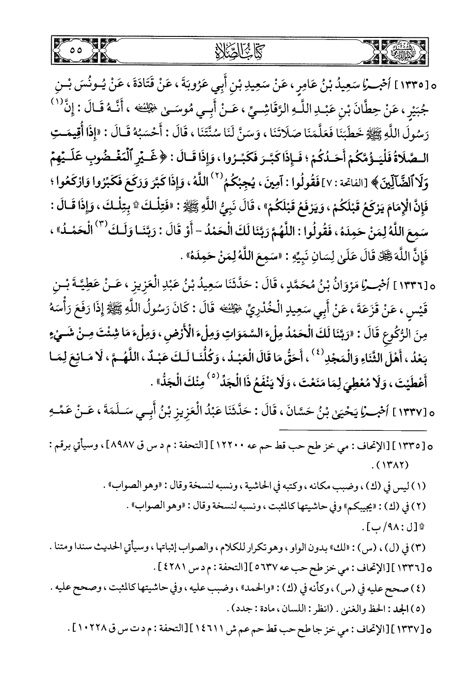 1335- أَخبَرَنا سَعِيدُ بْنُ عَامِرٍ, عَنْ سَعِيدِ بْنِ أَبِي عَرُوبَةَ, عَنْ قَتَادَةَ, عَنْ يُونُسَ بْنِ جُبَيْرٍ, عَنْ حِطَّانَ بْنِ عَبْدِ اللهِ الرَّقَاشِيِّ, عَنْ أَبِي مُوسَى رَضِيَ اللهُ عَنْهُ أَنَّهُ قَالَ: إِنَّ رَسُولَ اللهِ صَلى الله عَليهِ وسَلم خَطَبَنَا فَعَلَّمَنَا صَلاَتَنَا, وَسَنَّ لَنَا سُنَّتَنَا, قَالَ (1): أَحْسَبُهُ قَالَ: إِذَا أُقِيمَتِ الصَّلاَةُ, فَلْيَؤُمَّكُمْ أَحَدُكُمْ, فَإِذَا كَبَّرَ فَكَبِّرُوا, وَإِذَا قَالَ: {غَيْرِ الْمَغْضُوبِ عَلَيْهِمْ وَلاَ الضَّالِّينَ} فَقُولُوا: آمِينَ, يُجِبْكُمُ اللهُ, وَإِذَا كَبَّرَ وَرَكَعَ, فَكَبِّرُوا وَارْكَعَوا, فَإِنَّ الإِمَامَ يَرْكَعُ قَبْلَكُمْ, وَيَرْفَعُ قَبْلَكُمْ, قَالَ نَبِيُّ اللهِ صَلى الله عَليهِ وسَلم: فَتِلْكَ بِتِلْكَ, وَإِذَا قَالَ: سَمِعَ اللهُ لِمَنْ حَمِدَهُ, فَقُولُوا: اللهُمَّ رَبَّنَا لَكَ الْحَمْدُ, أَوْ قَالَ: رَبَّنَا وَلَكَ (2) الْحَمْدُ, فَإِنَّ اللهَ عَزَّ وَجَلَّ قَالَ عَلَى لِسَانِ نَبِيِّهِ: سَمِعَ اللهُ لِمَنْ حَمِدَهُ.