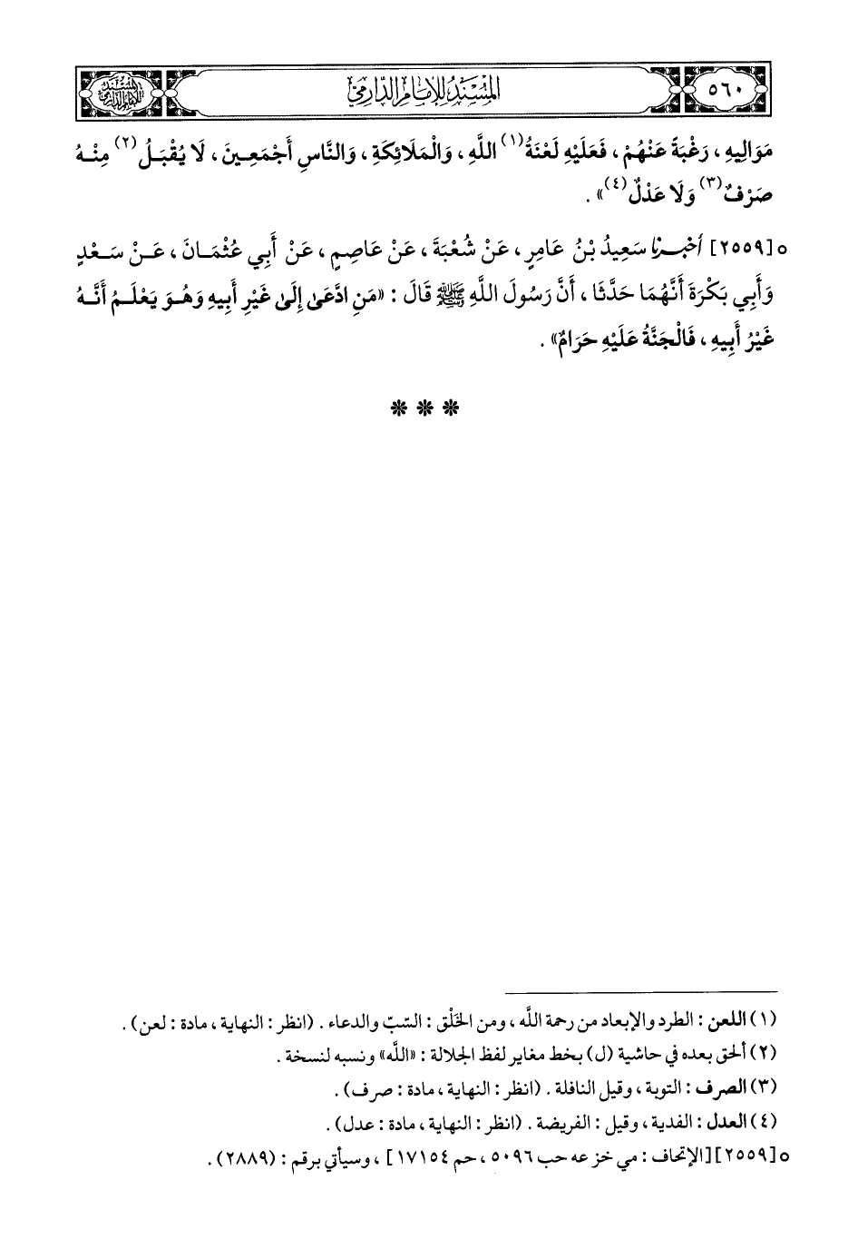 2559- أَخبَرَنا سَعِيدُ بْنُ عَامِرٍ, عَنْ شُعْبَةَ, عَنْ عَاصِمٍ, عَنْ أَبِي عُثْمَانَ, عَنْ سَعْدٍ, وَأَبِي بَكْرَةَ (1), أَنَّهُمَا حَدَّثَا؛ أَنَّ رَسُولَ اللهِ صَلى الله عَليهِ وسَلم, قَالَ: مَنِ ادَّعَى إِلَى غَيْرِ أَبِيهِ, وَهُوَ يَعْلَمُ أَنَّهُ غَيْرُ أَبِيهِ, فَالْجَنَّةُ عَلَيْهِ حَرَامٌ.