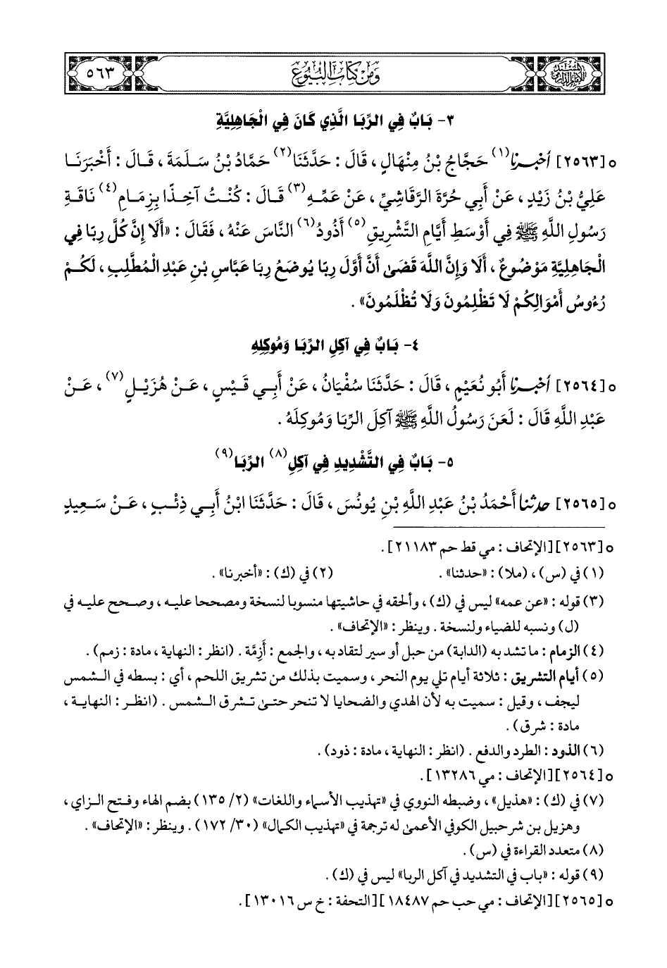 2563- أَخبَرَنا حَجَّاجُ بْنُ مِنْهالٍ, قَالَ: حَدَّثَنَا حَمَّادُ بْنُ سَلَمَةَ, قَالَ: أَخبَرَنا عَلِيُّ بْنُ زَيْدٍ, عَنْ أَبِي حُرَّةَ الرَّقَاشِيِّ, عَنْ عَمِّهِ, قَالَ: كُنْتُ آخِذًا بِزِمَامِ نَاقَةِ رَسُولِ اللهِ صَلى الله عَليهِ وسَلم فِي أَوْسَطِ أَيَّامِ التَّشْرِيقِ, أَذُودُ النَّاسَ عَنْهُ, فَقَالَ: أَلاَ إِنَّ كُلَّ رِبًا فِي الْجَاهِلِيَّةِ مَوْضُوعٌ, أَلاَ وَإِنَّ اللهَ قَضَى أَنَّ أَوَّلَ رِبًا يُوضَعُ رِبَا عَبَّاسِ بْنِ عَبْدِ الْمُطَّلِبِ, لَكُمْ رُؤُوسُ أَمْوَالِكُمْ, لاَ تَظْلِمُونَ وَلاَ تُظْلَمُونَ.