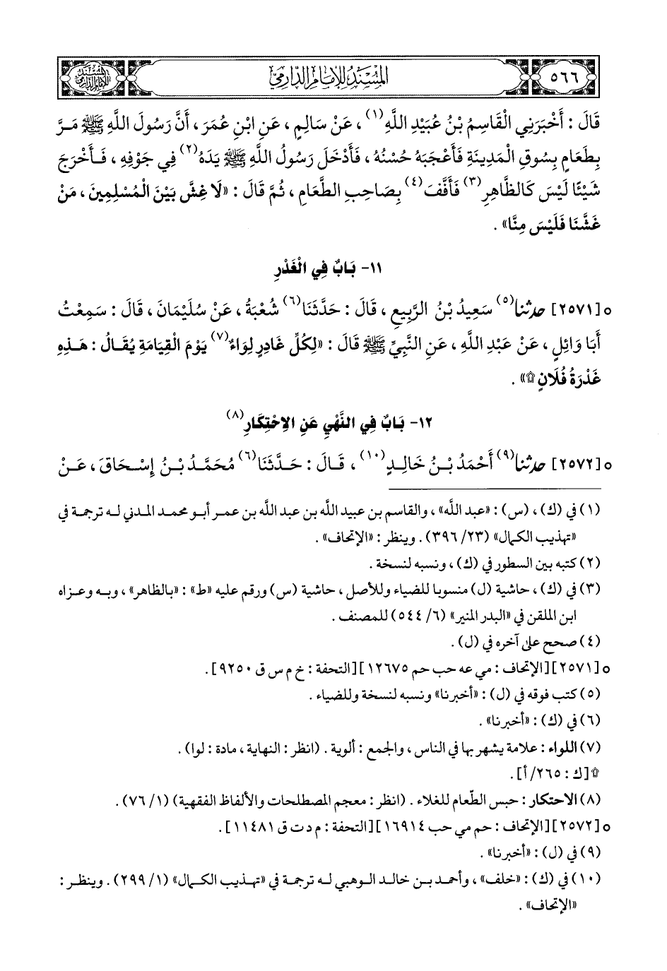 2572- حَدَّثَنَا أَحْمَدُ بْنُ خَالِدٍ, قَالَ: حَدَّثَنَا مُحَمَّدُ بْنُ إِسْحَاقَ, عَنْ مُحَمَّدِ بْنِ إِبْرَاهِيمَ, عَنْ سَعِيدِ بْنِ الْمُسَيَّبِ, عَنْ مَعْمَرِ بْنِ عَبْدِ اللهِ بْنِ نَافِعِ بْنِ نَضْلَةَ الْعَدَوِيِّ, قَالَ: سَمِعْتُ رَسُولَ اللهِ صَلى الله عَليهِ وسَلم يَقُولُ: لاَ يَحْتَكِرُ إِلاَّ خَاطِئٌ, مَرَّتَيْنِ.