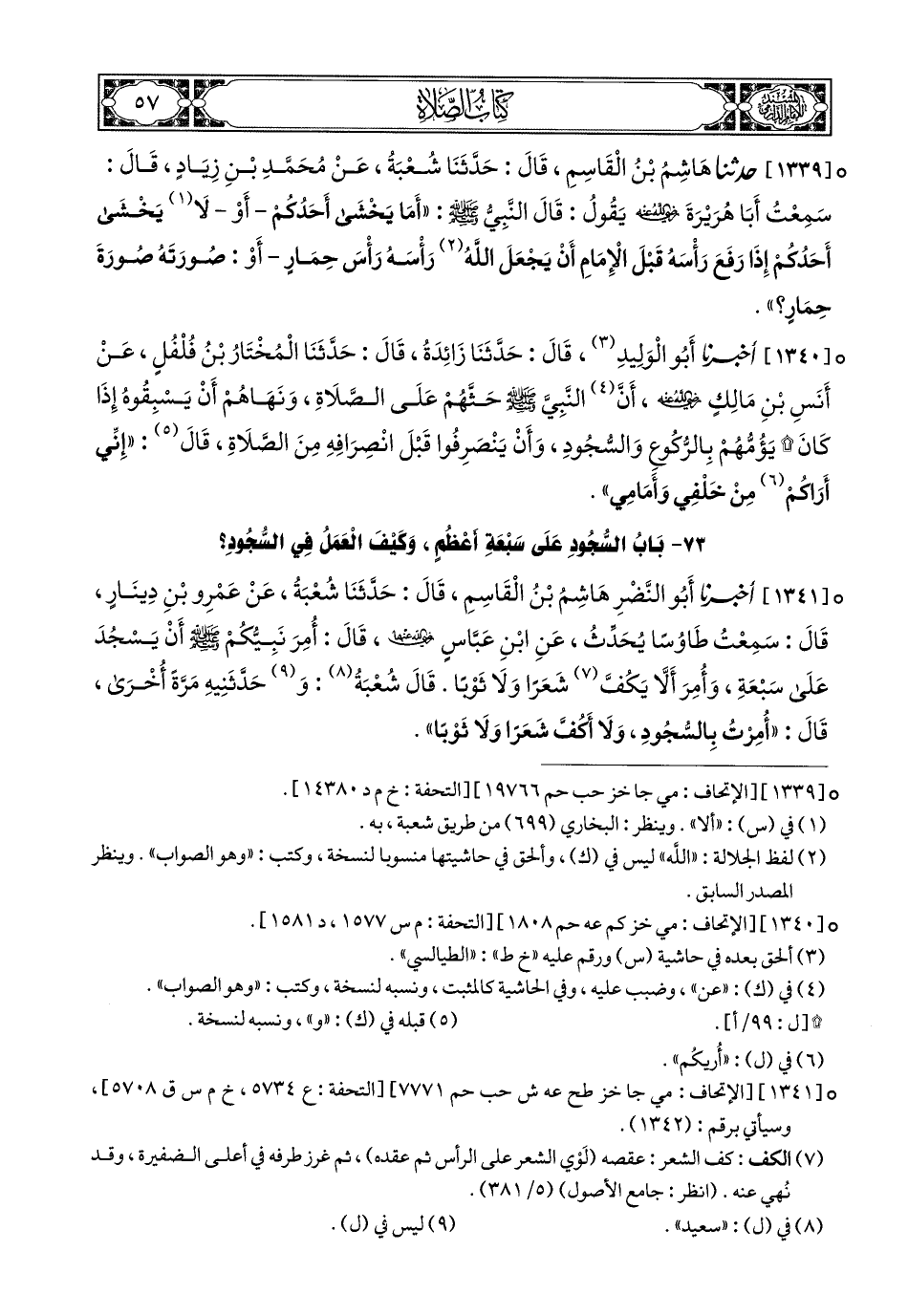 1341- أَخبَرَنا أَبُو النَّضْرِ هَاشِمُ بْنُ الْقَاسِمِ, قَالَ: حَدَّثَنَا شُعْبَةُ, عَنْ عَمْرِو بْنِ دِينَارٍ, قَالَ: سَمِعْتُ طَاوُوسًا يُحَدِّثُ عَنِ ابْنِ عَبَّاسٍ رَضِيَ اللهُ عَنْهُمَا, قَالَ: أُمِرَ نَبِيُّكُمْ صَلى الله عَليهِ وسَلم أَنْ يَسْجُدَ عَلَى سَبْعَةٍ وَأُمِرَ أَنْ لاَ يَكُفَّ شَعَرًا, وَلاَ ثَوْبًا.