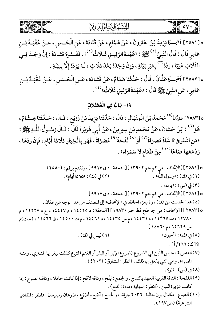 2581- أَخبَرَنا يَزِيدُ بْنُ هَارُونَ عَنْ هَمَّامٍ, عَنْ قَتَادَةَ, عَنِ الْحَسَنِ, عَنْ عُقْبَةَ بْنِ عَامِرٍ, قَالَ: قَالَ النبي صَلى الله عَليهِ وسَلم: عُهْدَةُ الرَّقِيقِ ثَلاَثٌ (1).