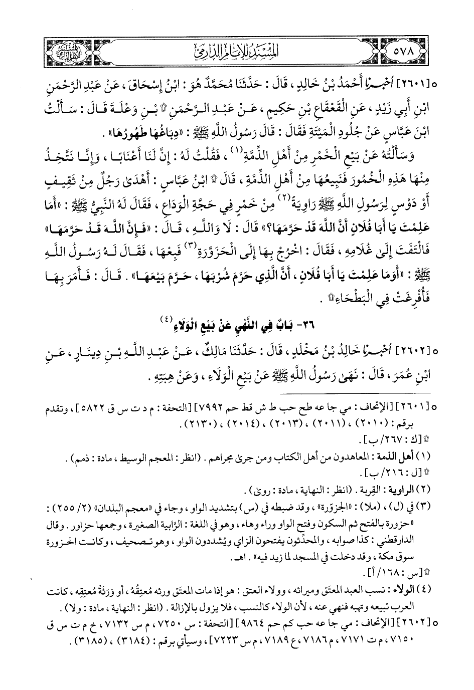 (3) قال محقق طبعة دار البشائر: تقدم في البيوع, باب النهي عن بيع الخمر وشرابها, ملاحظتنا على ما أورده الحافظ في إتحاف المهرة من أسانيد رواية ابن عباس التي أخرجها المصنف فلا حاجة لإعادتها هنا.