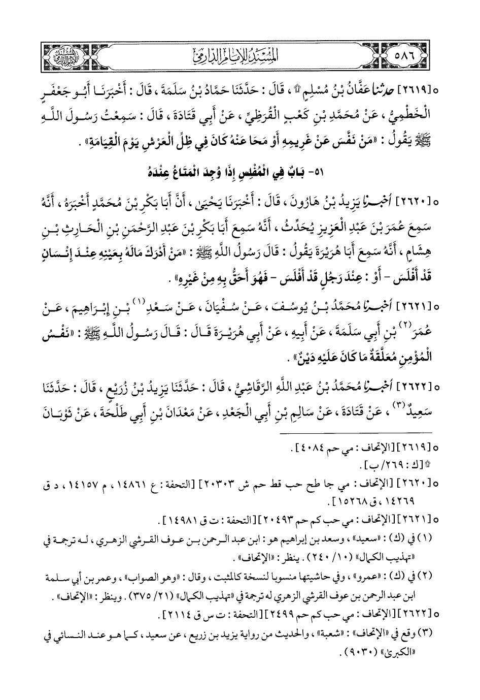2620- أَخبَرَنا يَزِيدُ بْنُ هَارُونَ, قَالَ: أَخبَرَنا يَحْيَى (1), أَنَّ أَبَا بَكْرِ بْنَ مُحَمَّدٍ أَخْبَرَهُ, أَنَّهُ سَمِعَ عُمَرَ بْنَ عَبْدِ الْعَزِيزِ يُحَدِّثُ, أَنَّهُ سَمِعَ أَبَا بَكْرِ بْنَ عَبْدِ الرَّحْمَنِ بْنِ الْحَارِثِ بْنِ هِشَامٍ, أَنَّهُ سَمِعَ أَبَا هُرَيْرَةَ يَقُولُ: قَالَ رَسُولُ اللهِ صَلى الله عَليهِ وسَلم: مَنْ أَدْرَكَ مَالَهُ بِعَيْنِهِ عِنْدَ إِنْسَانٍ قَدْ أَفْلَسَ, أَوْ عِنْدَ رَجُلٍ قَدْ أَفْلَسَ, فَهُوَ أَحَقُّ بِهِ مِنْ غَيْرِهِ.