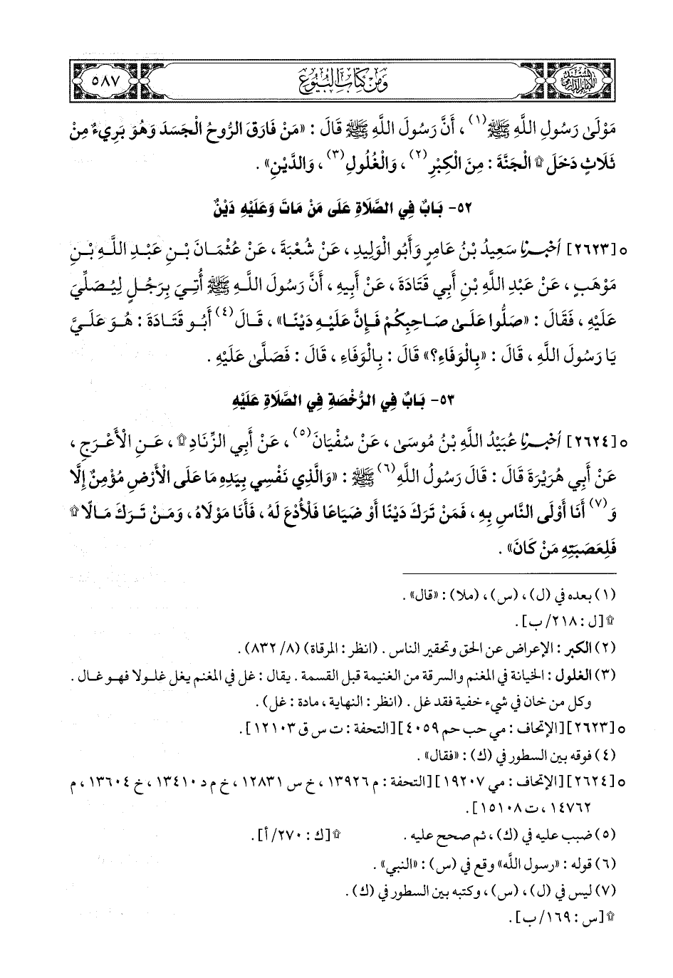 2623- أَخبَرَنا سَعِيدُ بْنُ عَامِرٍ, وَأَبُو الْوَلِيدِ, عَنْ (1) شُعْبَةَ, عَنْ عُثْمَانَ بْنِ عَبْدِ اللهِ بْنِ مَوْهَبٍ, عَنْ عَبْدِ اللهِ بْنِ أَبِي قَتَادَةَ, عَنْ أَبِيهِ؛ أَنَّ رَسُولَ اللهِ صَلى الله عَليهِ وسَلم أُتِيَ بِرَجُلٍ لِيُصَلِّيَ عَلَيْهِ, فَقَالَ: صَلُّوا عَلَى صَاحِبِكُمْ, فَإِنَّ عَلَيْهِ دَيْنًا, قَالَ أَبُو قَتَادَةَ: هُوَ عَلَيَّ يَا رَسُولَ اللهِ, قَالَ: بِالْوَفَاءِ, قَالَ: بِالْوَفَاءِ, قال (2): فَصَلَّى عَلَيْهِ.