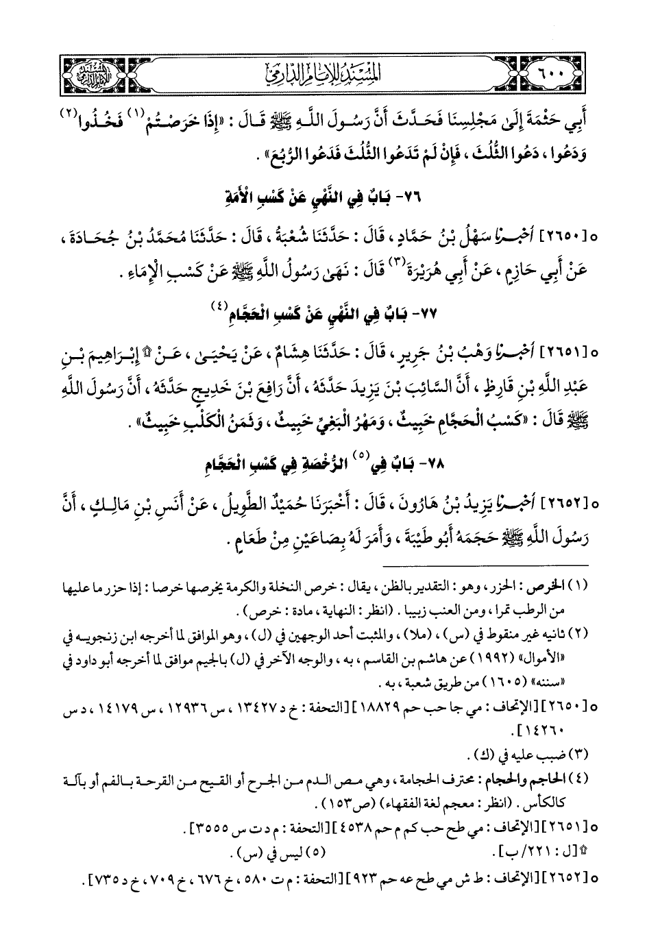 2652- أَخبَرَنا يَزِيدُ بْنُ هَارُونَ, قَالَ: أَخبَرَنا حُمَيْدٌ الطَّوِيلُ, عَنْ أَنَسِ بْنِ مَالِكٍ, أَنَّ رَسُولَ اللهِ صَلى الله عَليهِ وسَلم حَجَمَهُ أَبُو طَيْبَةَ, وَأَمَرَ لَهُ بِصَاعَيْنِ مِنْ طَعَامٍ.