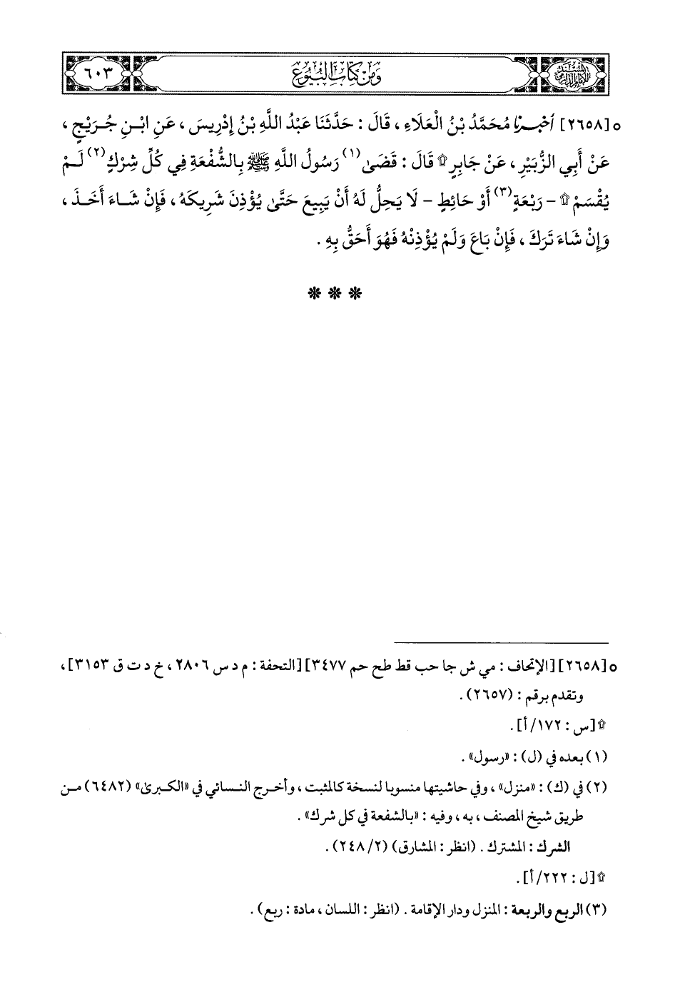 2658- أَخبَرَنا مُحَمَّدُ بْنُ الْعَلاَءِ, قَالَ: حَدَّثَنَا عَبْدُ اللهِ بْنُ إِدْرِيسَ, عَنِ ابْنِ جُرَيْجٍ, عَنْ أَبِي الزُّبَيْرِ, عَنْ جَابِرٍ, قَالَ: قَضَى رَسُولُ اللهِ صَلى الله عَليهِ وسَلم بِالشُّفْعَةِ فِي كُلِّ شِرْكٍ لَمْ يُقْسَمْ رَبْعَةٍ, أَوْ حَائِطٍ, لاَ يَحِلُّ لَهُ أَنْ يَبِيعَ حَتَّى يُؤْذِنَ شَرِيكَهُ, فَإِنْ شَاءَ أَخَذَ وَإِنْ شَاءَ تَرَكَ, فَإِنْ بَاعَ وَلَمْ (1) يُؤْذِنْهُ, فَهُوَ أَحَقُّ بِهِ (2).