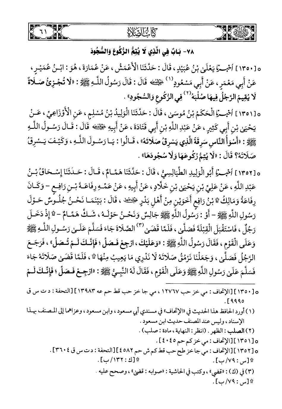 1350- أَخبَرَنا يَعْلَى بْنُ عُبَيْدٍ, قَالَ: حَدَّثَنَا الأَعْمَشُ, عَنْ عُمَارَةَ, هُوَ ابْنُ عُمَيْرٍ, عَنْ أَبِي مَعْمَرٍ, عَنْ أَبِي مَسْعُودٍ رَضِيَ اللهُ عَنْهُ, قَالَ: قَالَ رَسُولُ اللهِ صَلى الله عَليهِ وسَلم: لاَ تُجْزِئُ صَلاَةٌ لاَ يُقِيمُ الرَّجُلُ فِيهَا صُلْبَهُ فِي الرُّكُوعِ وَالسُّجُودِ.