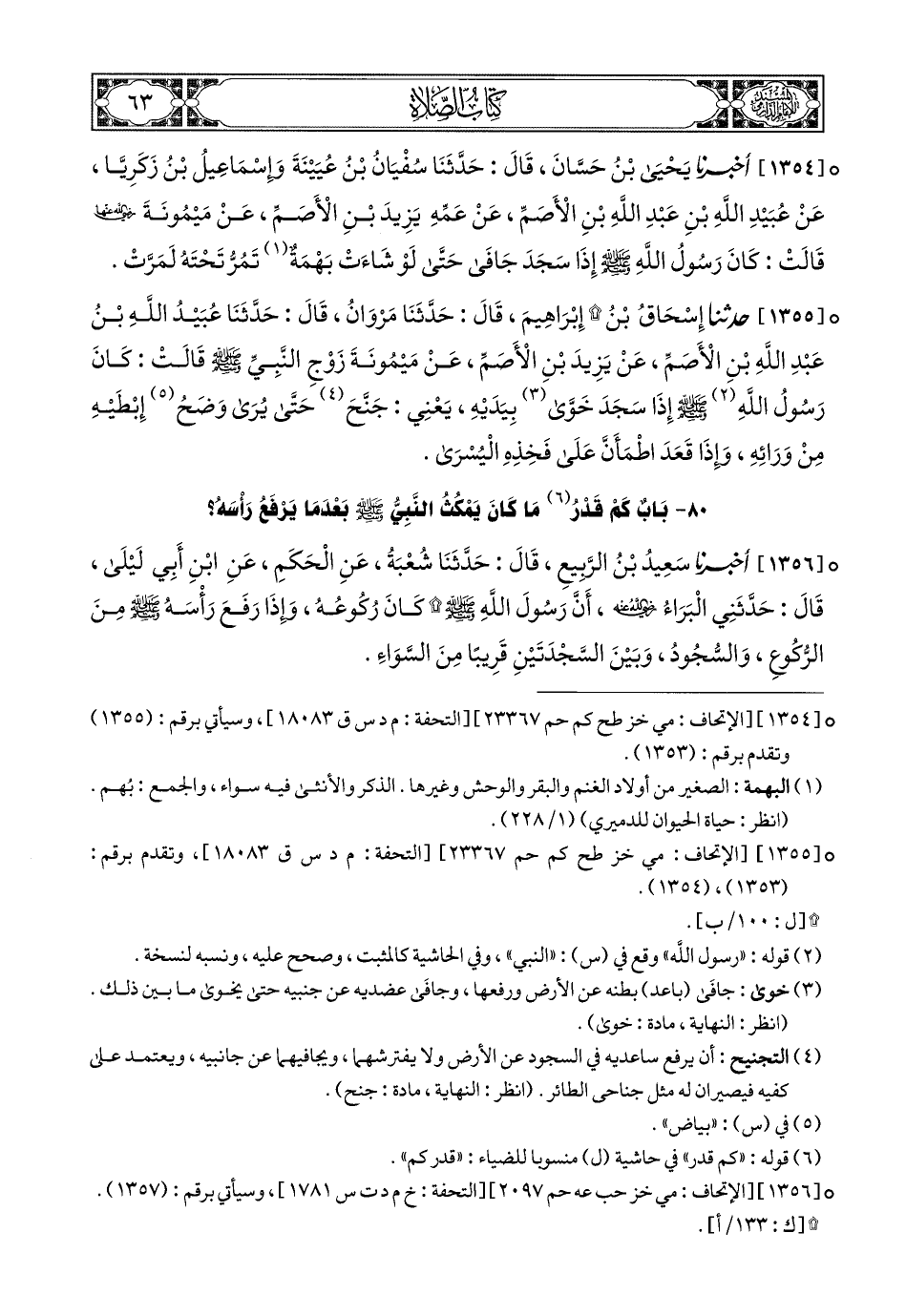 1356- أَخبَرَنا سَعِيدُ بْنُ الرَّبِيعِ, قَالَ: حَدَّثَنَا شُعْبَةُ, عَنِ الْحَكَمِ, عَنِ ابْنِ أَبِي لَيْلَى, قَالَ: حَدَّثَنِي الْبَرَاءُ رَضِيَ اللهُ عَنْهُ؛ أَنَّ رَسُولَ اللهِ صَلى الله عَليهِ وسَلم كَانَ رُكُوعُهُ, وَإِذَا رَفَعَ رَأْسَهُ صَلى الله عَليهِ وسَلم مِنَ الرُّكُوعِ وَالسُّجُودِ (2) وَبَيْنَ السَّجْدَتَيْنِ قَرِيبًا مِنَ السَّوَاءِ.