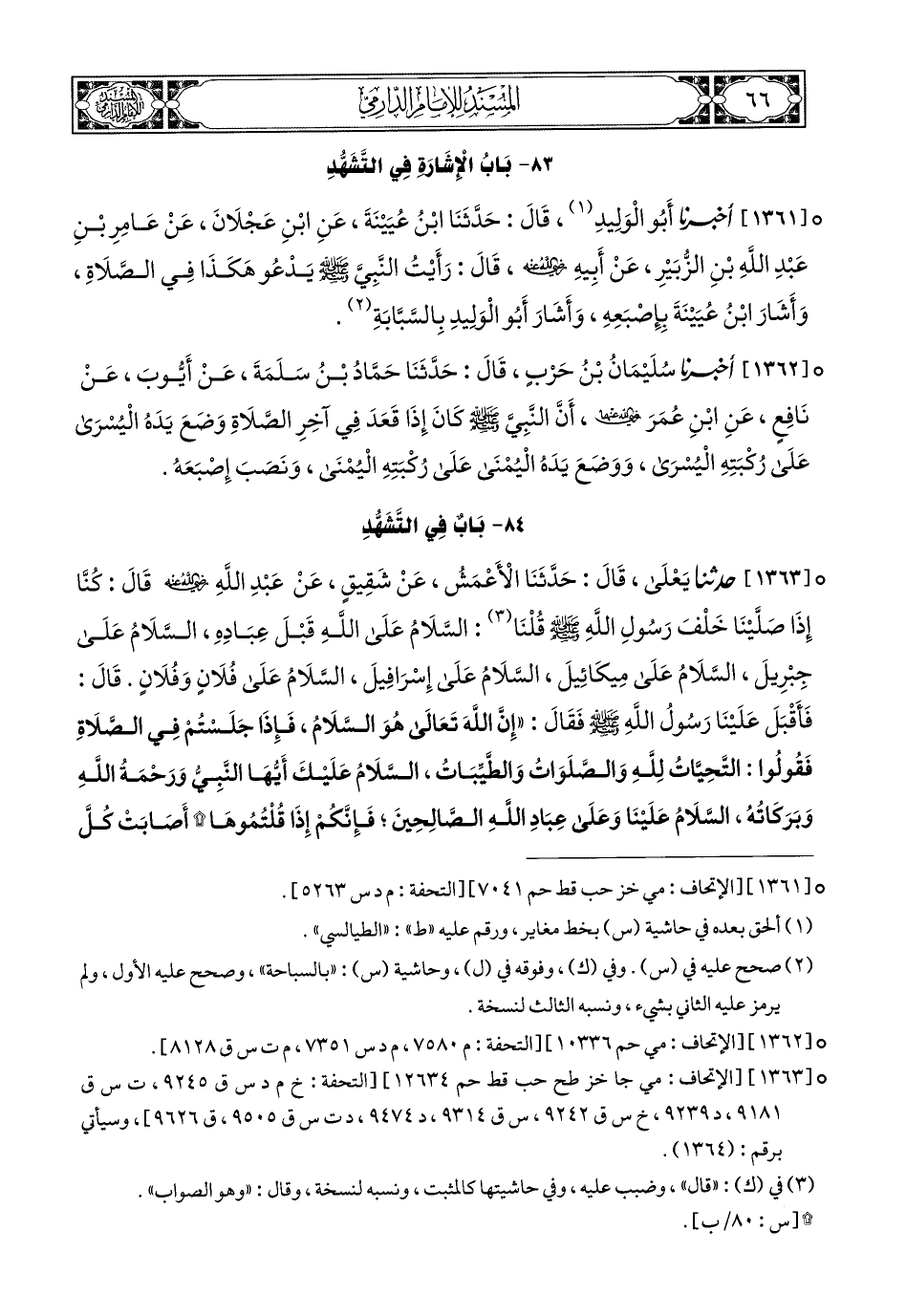 1362- أَخبَرَنا سُلَيْمَانُ بْنُ حَرْبٍ, قَالَ: حَدَّثَنَا حَمَّادُ بْنُ سَلَمَةَ, عَنْ أَيُّوبَ, عَنْ نَافِعٍ, عَنِ ابْنِ عُمَرَ رَضِيَ اللهُ عَنْهُمَا؛ أَنَّ النَّبِيَّ صَلى الله عَليهِ وسَلم كَانَ إِذَا قَعَدَ فِي آخِرِ الصَّلاَةِ وَضَعَ يَدَهُ الْيُسْرَى عَلَى رُكْبَتِهِ الْيُسْرَى, وَوَضَعَ يَدَهُ الْيُمْنَى عَلَى رُكْبَتِهِ الْيُمْنَى, وَنَصَبَ إِصْبَعَهُ.