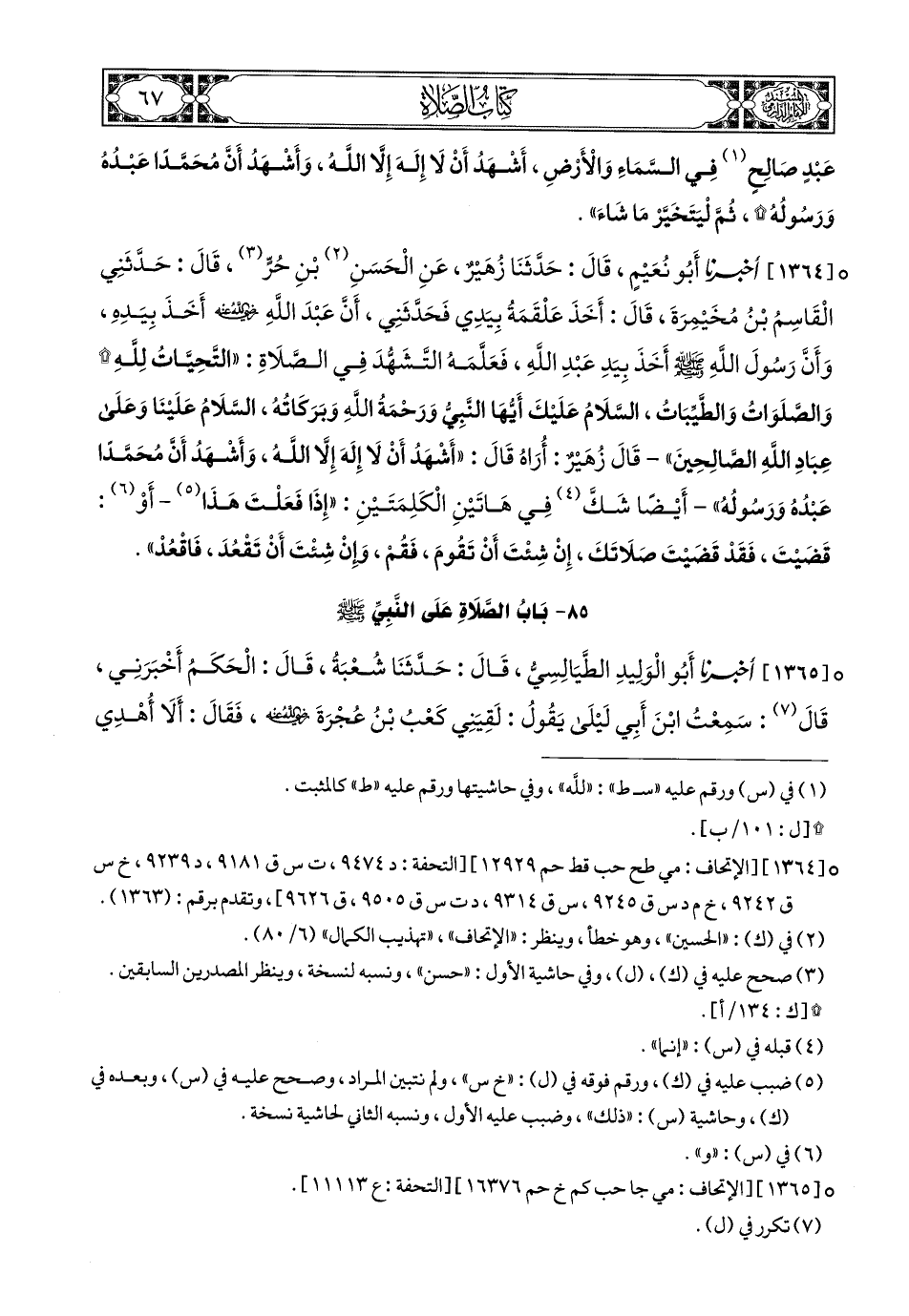 1365- أَخبَرَنا أَبُو الْوَلِيدِ الطَّيَالِسِيُّ, قَالَ: حَدَّثَنَا شُعْبَةُ, قَالَ: الْحَكَمُ أَخْبَرَنِي, قَالَ: سَمِعْتُ ابْنَ أَبِي لَيْلَى يَقُولَ: لَقِيَنِي كَعْبُ بْنُ عُجْرَةَ رَضِيَ اللهُ عَنْهُ, فَقَالَ: أَلاَ أُهْدِي لَكَ هَدِيَّةً؟ إِنَّ رَسُولَ اللهِ صَلى الله عَليهِ وسَلم خَرَجَ عَلَيْنَا, فَقُلْنَا: قَدْ عَلِمْنَا السَّلاَمَ عَلَيْكَ, فَكَيْفَ نُصَلِّي؟ قَالَ: قُولُوا: اللهُمَّ صَلِّ عَلَى مُحَمَّدٍ, وَعَلَى آلِ مُحَمَّدٍ, كَمَا صَلَّيْتَ عَلَى آلِ إِبْرَاهِيمَ إِنَّكَ حَمِيدٌ مَجِيدٌ, وَبَارِكْ عَلَى مُحَمَّدٍ, وَعَلَى آلِ مُحَمَّدٍ كَمَا بَارَكْتَ عَلَى آلِ إِبْرَاهِيمَ إِنَّكَ حَمِيدٌ مَجِيدٌ.