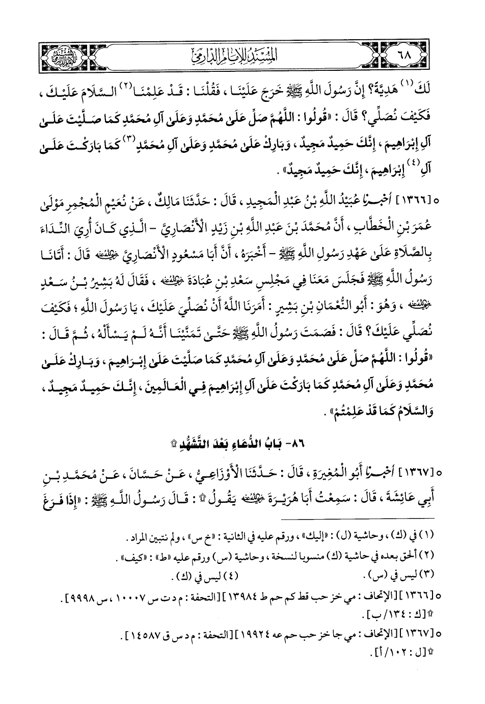 1366- أَخبَرَنا عُبَيْدُ اللهِ بْنُ عَبْدِ الْمَجِيدِ, قَالَ: حَدَّثَنَا مَالِكٌ, عَنْ نُعَيْمٍ الْمُجْمِرِ, مَوْلَى عُمَرَ بْنِ الْخَطَّابِ, أَنَّ مُحَمَّدَ بْنَ عَبْدِ اللهِ بْنِ زَيْدٍ الأَنْصَارِيَّ (1), الَّذِي كَانَ أُرِيَ النِّدَاءَ بِالصَّلاَةِ عَلَى عَهْدِ رَسُولِ اللهِ صَلى الله عَليهِ وسَلم أَخْبَرَهُ, أَنَّ أَبَا مَسْعُودٍ الأَنْصَارِيَّ رَضِيَ اللهُ عَنْهُ, قَالَ: أَتَانَا رَسُولُ اللهِ صَلى الله عَليهِ وسَلم, فَجَلَسَ مَعَنَا فِي مَجْلِسِ سَعْدِ بْنِ عُبَادَةَ رَضِيَ اللهُ عَنْهُ, فَقَالَ لَهُ بَشِيرُ بْنُ سَعْدٍ رَضِيَ اللهُ عَنْهُ, وَهُوَ أَبُو النُّعْمَانِ بْنِ بَشِيرٍ: أَمَرَنَا اللهُ أَنْ نُصَلِّيَ عَلَيْكَ يَا رَسُولَ اللهِ, فَكَيْفَ نُصَلِّي عَلَيْكَ؟ قَالَ: فَصَمَتَ رَسُولُ اللهِ صَلى الله عَليهِ وسَلم, حَتَّى تَمَنَّيْنَا أَنَّهُ لَمْ يَسْأَلْهُ, ثُمْ قَالَ: قُولُوا: اللهُمَّ صَلِّ عَلَى مُحَمَّدٍ وَعَلَى آلِ مُحَمَّدٍ كَمَا صَلَّيْتَ عَلَى آلِ إِبْرَاهِيمَ, وَبَارِكْ عَلَى مُحَمَّدٍ وَعَلَى آلِ مُحَمَّدٍ كَمَا بَارَكْتَ عَلَى آلِ إِبْرَاهِيمَ فِي الْعَالَمِينَ, إِنَّكَ حَمِيدٌ مَجِيدٌ, وَالسَّلاَمُ كَمَا قَدْ عَلِمْتُمْ.