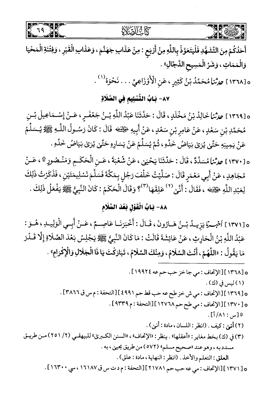1371- أَخبَرَنا يَزِيدُ بْنُ هَارُونَ, قَالَ: أَخبَرَنا عَاصِمٌ, عَنْ أَبِي الْوَلِيدِ, هُوَ عَبْدُ اللهِ بْنُ الْحَارِثِ, عَنْ عَائِشَةَ, قَالَتْ: مَا كَانَ النَّبِيُّ صَلى الله عَليهِ وسَلم يَجْلِسُ بَعْدَ الصَّلاَةِ, إِلاَّ قَدْرَ مَا يَقُولُ: اللهُمَّ أَنْتَ السَّلاَمُ وَمِنْكَ السَّلاَمُ تَبَارَكْتَ يَا ذَا الْجَلاَلِ وَالإِكْرَامِ.