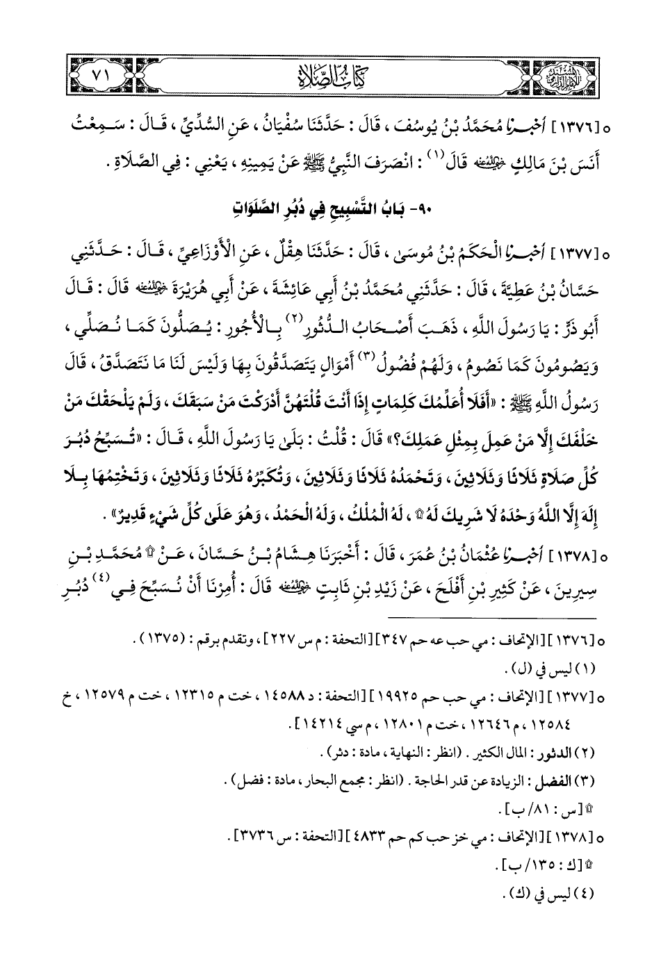 1377- أَخبَرَنا الْحَكَمُ بْنُ مُوسَى, قَالَ: حَدَّثَنَا هِقْلٌ, عَنِ الأَوْزَاعِيِّ, قَالَ: حَدَّثَنِي حَسَّانُ بْنُ عَطِيَّةَ, قَالَ: حَدَّثَنِي مُحَمَّدُ بْنُ أَبِي عَائِشَةَ, عَنْ أَبِي هُرَيْرَةَ رَضِيَ اللهُ عَنْهُ, قَالَ: قَالَ أَبُو ذَرٍّ: يَا رَسُولَ اللهِ, ذَهَبَ أَصْحَابُ الدُّثُورِ بِالأُجُورِ, يُصَلُّونَ كَمَا نُصَلِّي, وَيَصُومُونَ كَمَا نَصُومُ, وَلَهُمْ فُضُولُ أَمْوَالٍ يَتَصَدَّقُونَ بِهَا, وَلَيْسَ لَنَا مَا نَتَصَدَّقُ, قَالَ رَسُولُ اللهِ صَلى الله عَليهِ وسَلم: أَفلاَ أُعَلِّمُكَ كَلِمَاتٍ إِذَا أَنْتَ قُلْتَهُنَّ, أَدْرَكْتَ مَنْ سَبَقَكَ, وَلَمْ يَلْحَقْكَ مَنْ خَلْفَكَ, إِلاَّ مَنْ عَمِلَ بِمِثْلِ عَمَلِكَ؟ قَالَ: قُلْتُ: بَلَى يَا رَسُولَ اللهِ, قَالَ: تُسَبِّحُ دُبُرَ كُلِّ صَلاَةٍ ثَلاَثًا وَثَلاَثِينَ, وَتَحْمَدُهُ ثَلاَثًا وَثَلاَثِينَ, وَتُكَبِّرُهُ ثَلاَثًا وَثَلاَثِينَ, وَتَخْتِمُهَا بِلاَ إِلَهَ إِلاَّ اللهُ وَحْدَهُ لاَ شَرِيكَ لَهُ, لَهُ الْمُلْكُ وَلَهُ الْحَمْدُ وَهُوَ عَلَى كُلِّ شَيْءٍ قَدِيرٌ.