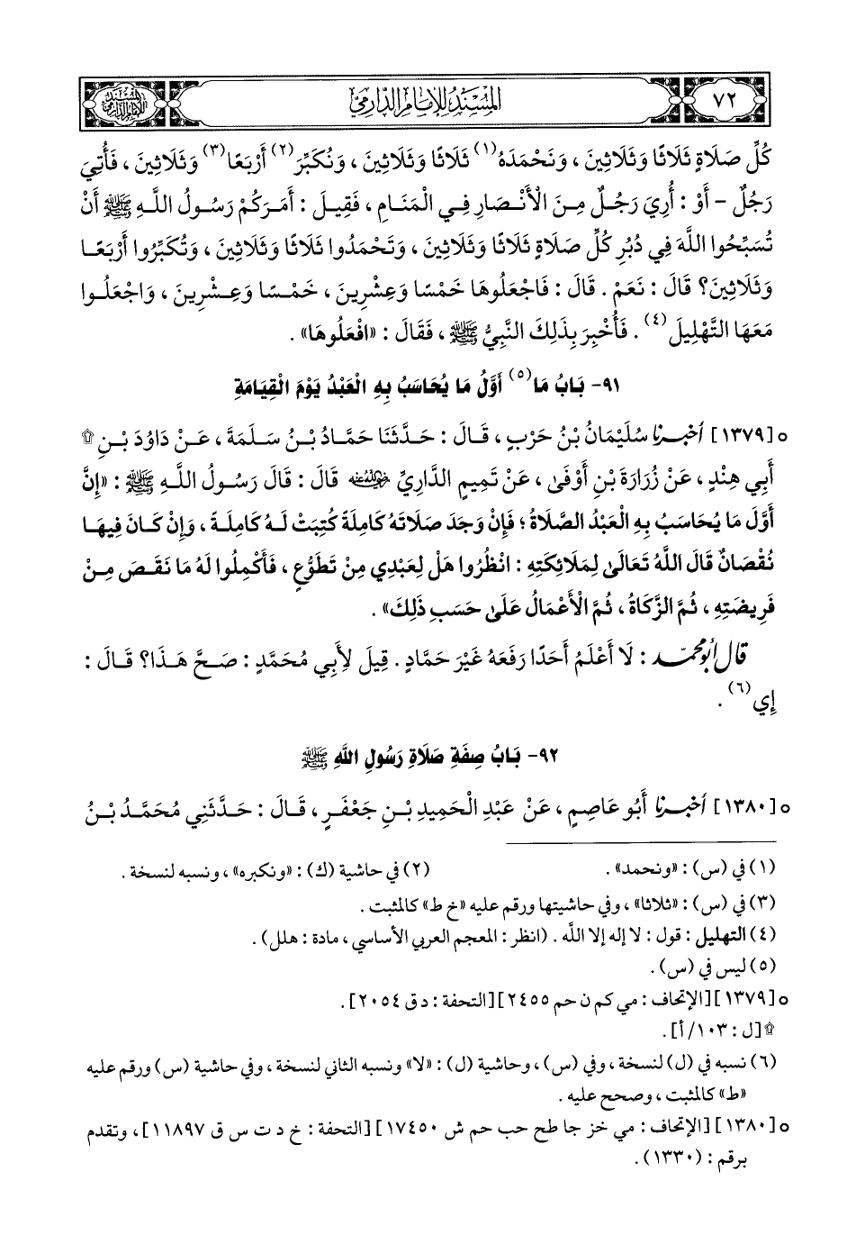 1379- أَخبَرَنا سُلَيْمَانُ بْنُ حَرْبٍ, قَالَ: حَدَّثَنَا حَمَّادُ بْنُ سَلَمَةَ, عَنْ دَاوُدَ بْنِ أَبِي هِنْدٍ, عَنْ زُرَارَةَ بْنِ أَوْفَى, عَنْ تَمِيمٍ الدَّارِيِّ رَضِيَ اللهُ عَنْهُ, قَالَ: قَالَ رَسُولُ اللهِ صَلى الله عَليهِ وسَلم: إِنَّ أَوَّلَ مَا يُحَاسَبُ بِهِ الْعَبْدُ الصَّلاَةُ, فَإِنْ وَجَدَ صَلاَتَهُ كَامِلَةً, كُتِبَتْ لَهُ كَامِلَةً, وَإِنْ كَانَ فِيهَا نُقْصَانٌ, قَالَ اللهُ تَعَالَى لِمَلاَئِكَتِهِ: انْظُرُوا هَلْ لِعَبْدِي مِنْ تَطَوُّعٍ, فَأَكْمِلُوا لَهُ مَا نَقَصَ مِنْ فَرِيضَتِهِ, ثُمَّ الزَّكَاةُ, ثُمَّ الأَعْمَالُ عَلَى حَسَبِ ذَلِكَ.