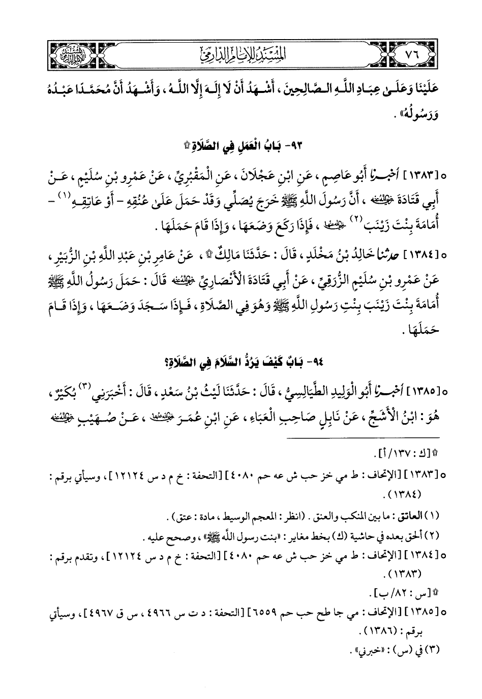 1383- أَخبَرَنا أَبُو عَاصِمٍ, عَنِ ابْنِ عَجْلاَنَ, عَنِ الْمَقْبُرِيِّ, عَنْ عَمْرِو بْنِ سُلَيْمٍ, عَنْ أَبِي قَتَادَةَ رَضِيَ اللهُ عَنْهُ, أَنَّ رَسُولَ اللهِ صَلى الله عَليهِ وسَلم خَرَجَ يُصَلِّي وَقَدْ حَمَلَ عَلَى عُنُقِهِ, أَوْ عَاتِقِهِ, أُمَامَةَ بِنْتَ زَيْنَبَ رَضِيَ اللهُ عَنْهَا, فَإِذَا رَكَعَ وَضَعَهَا, وَإِذَا قَامَ حَمَلَهَا.