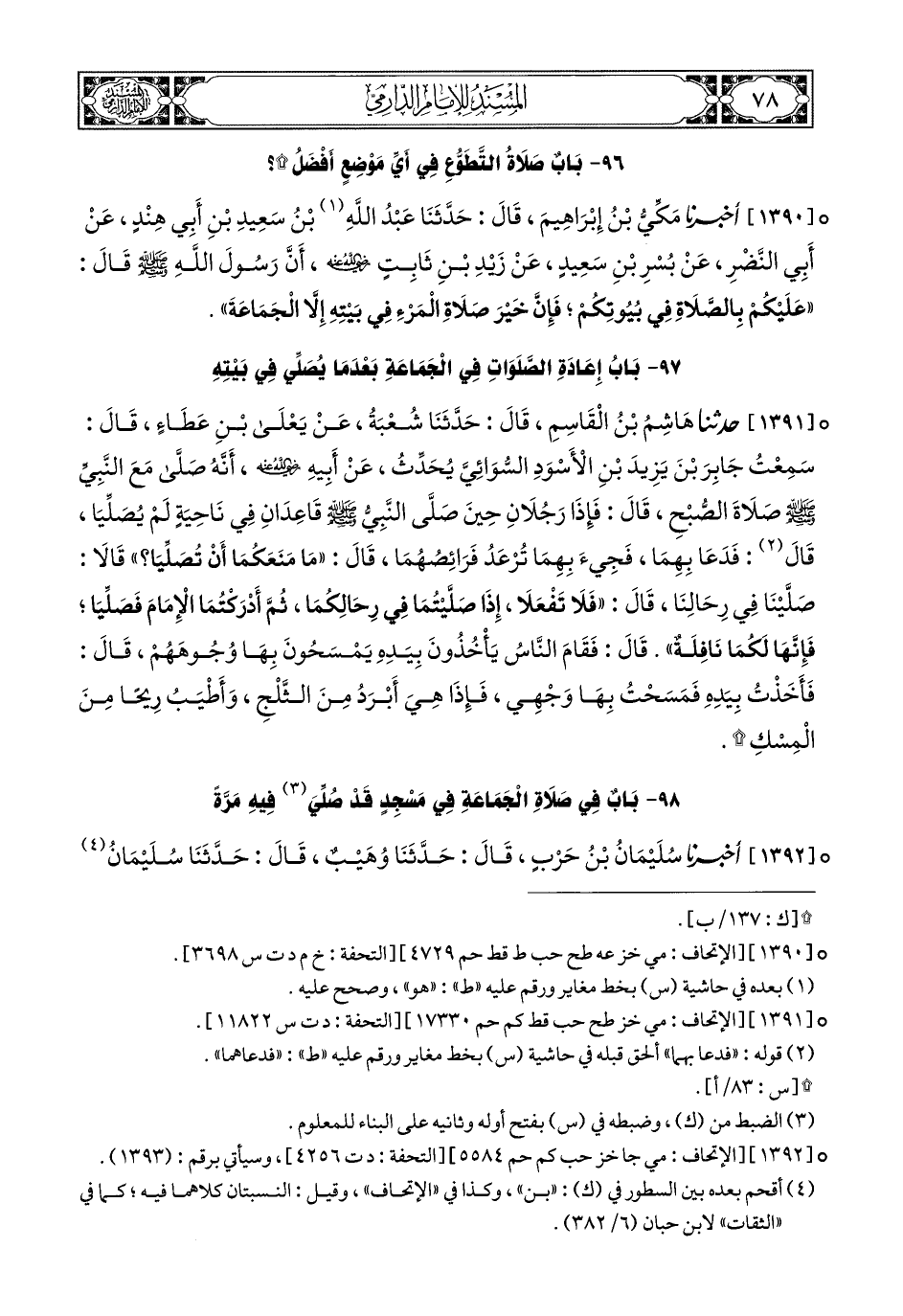 1390- أَخبَرَنا مَكِّيُّ بْنُ إِبْرَاهِيمَ, قَالَ: حَدَّثَنَا عَبْدُ اللهِ بْنُ سَعِيدِ بْنِ أَبِي هِنْدٍ, عَنْ أَبِي النَّضْرِ, عَنْ بُسْرِ بْنِ سَعِيدٍ, عَنْ زَيْدِ بْنِ ثَابِتٍ رَضِيَ اللهُ عَنْهُ, أَنَّ رَسُولَ اللهِ صَلى الله عَليهِ وسَلم, قَالَ: عَلَيْكُمْ بِالصَّلاَةِ فِي بُيُوتِكُمْ, فَإِنَّ خَيْرَ صَلاَةِ الْمَرْءِ فِي بَيْتِهِ إِلاَّ الْجَمَاعَةَ.