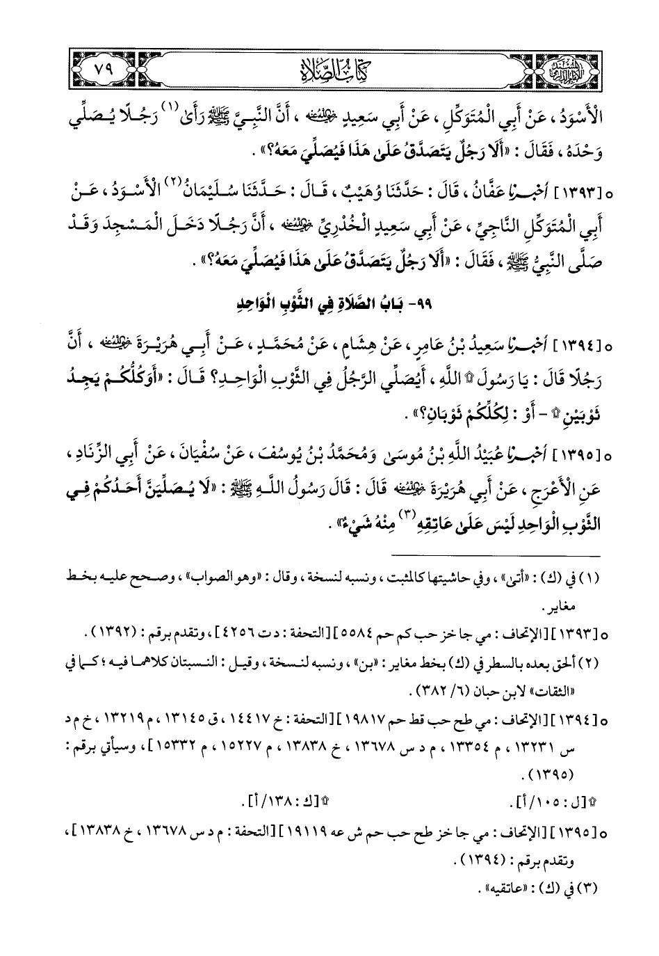 1395- أَخبَرَنا عُبَيْدُ اللهِ بْنُ مُوسَى, وَمُحَمَّدُ بْنُ يُوسُفَ, عَنْ سُفْيَانَ, عَنْ أَبِي الزِّنَادِ, عَنِ الأَعْرَجِ, عَنْ أَبِي هُرَيْرَةَ رَضِيَ اللهُ عَنْهُ, قَالَ: قَالَ رَسُولُ اللهِ صَلى الله عَليهِ وسَلم: لاَ يُصَلِّيَنَّ أَحَدُكُمْ فِي الثَّوْبِ الْوَاحِدِ, لَيْسَ عَلَى عَاتِقِهِ (1) مِنْهُ شَيْءٌ.