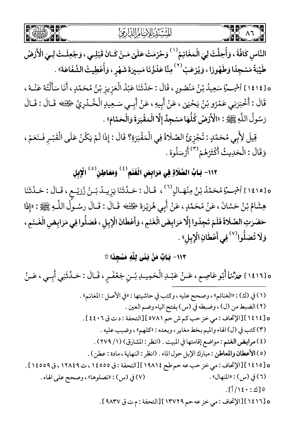 1414 - أَخبَرَنا سَعِيدُ بْنُ مَنْصُورٍ, قَالَ: حَدَّثَنَا عَبْدُ الْعَزِيزِ بْنُ مُحَمَّدٍ, أَنَا سَأَلْتُهُ عَنْهُ, قَالَ: أَخبَرَنِي عَمْرُو بْنُ يَحْيَى, عَنْ أَبِيهِ, عَنْ أَبِي سَعِيدٍ الْخُدْرِيِّ رَضِيَ اللهُ عَنْهُ, قَالَ: قَالَ رَسُولُ اللهِ صَلى الله عَليهِ وسَلم: الأَرْضُ كُلُّهَا مَسْجِدٌ, إِلاَّ الْمَقْبَرَةَ وَالْحَمَّامَ.