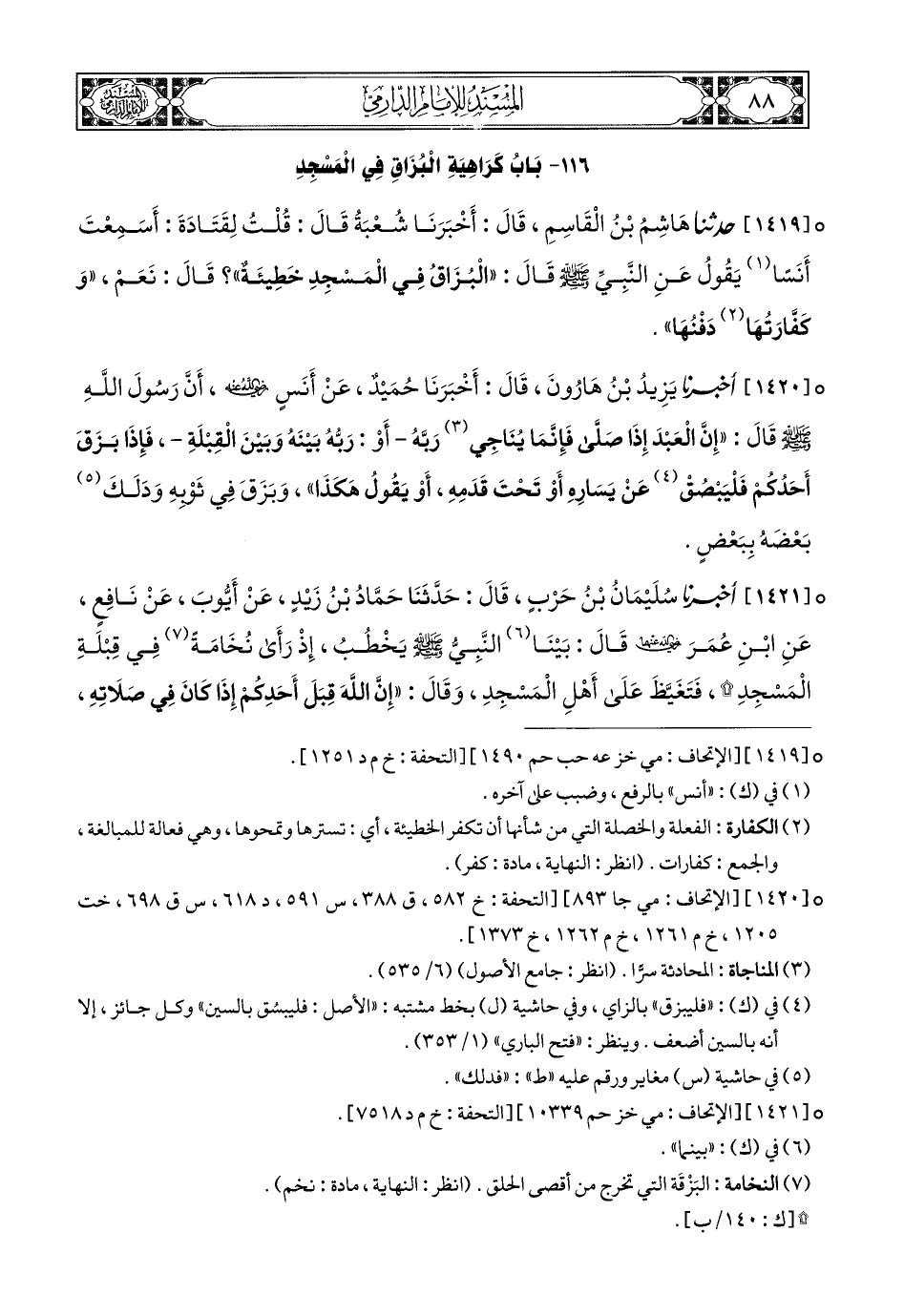 1419- حَدَّثَنَا هَاشِمُ بْنُ الْقَاسِمِ, قَالَ: أَخبَرَنا شُعْبَةُ, قَالَ: قُلْتُ لِقَتَادَةَ: أَسَمِعْتَ أَنَسًا يَقُولُ عَنِ النَّبِيِّ صَلى الله عَليهِ وسَلم قَالَ (1): الْبُزَاقُ فِي الْمَسْجِدِ خَطِيئَةٌ؟ قَالَ: نَعَمْ, وَكَفَّارَتُهَا دَفْنُهَا.