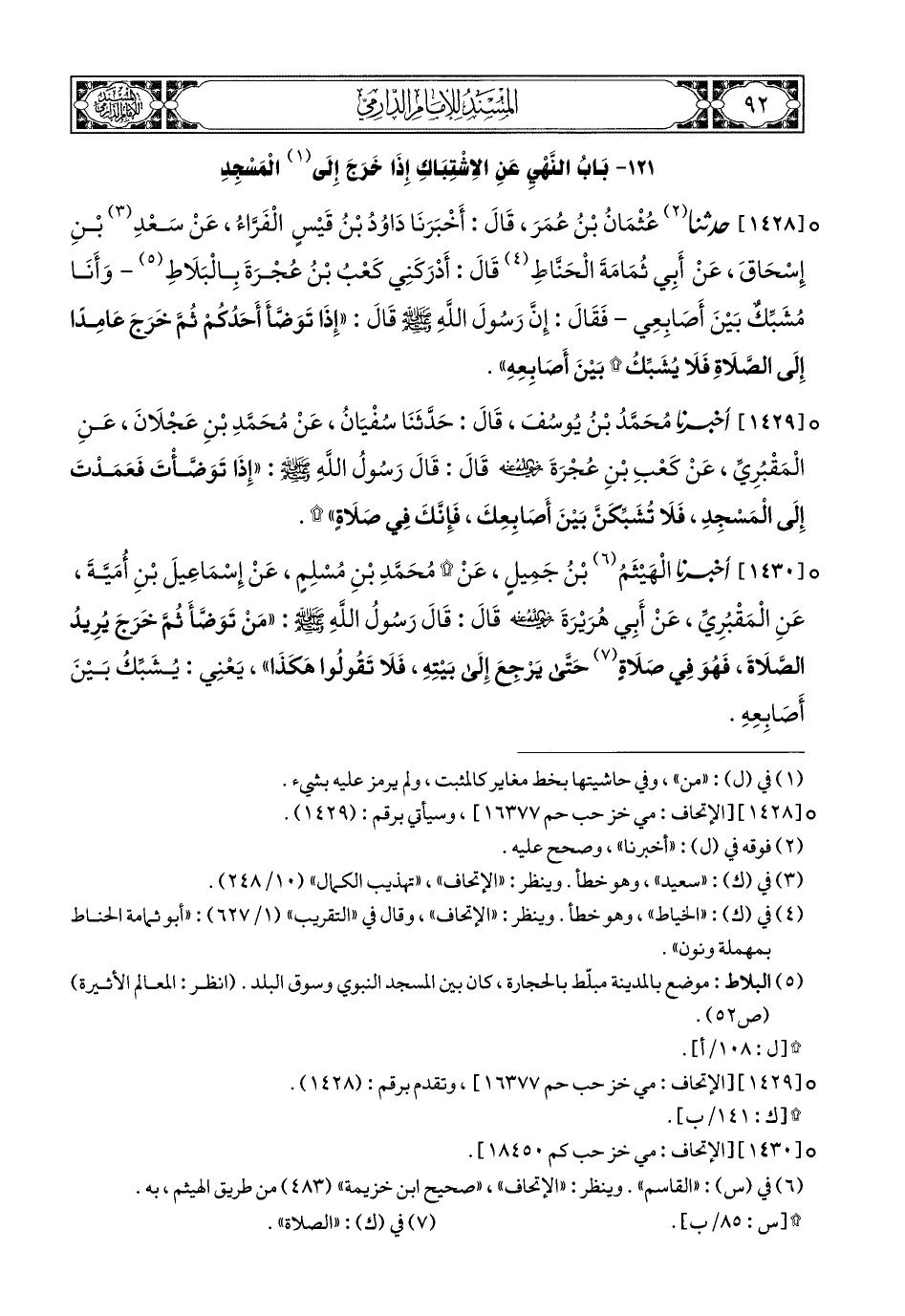 1428- حَدَّثَنَا عُثْمَانُ بْنُ عُمَرَ, قَالَ: أَخبَرَنا دَاوُدُ بْنُ قَيْسٍ الْفَرَّاءُ, عَنْ سَعْدِ بْنِ إِسْحَاقَ, عَنْ أَبِي ثُمَامَةَ الْحَنَّاطِ, قَالَ: أَدْرَكَنِي كَعْبُ بْنُ عُجْرَةَ بِالْبَلاَطِ, وَأَنَا مُشَبِّكٌ بَيْنَ أَصَابِعِي, فَقَالَ: إِنَّ رَسُولَ اللهِ صَلى الله عَليهِ وسَلم, قَالَ: إِذَا تَوَضَّأَ أَحَدُكُمْ, ثُمَّ خَرَجَ عَامِدًا إِلَى الصَّلاَةِ, فَلاَ يُشَبِّكُ بَيْنَ أَصَابِعِهِ.