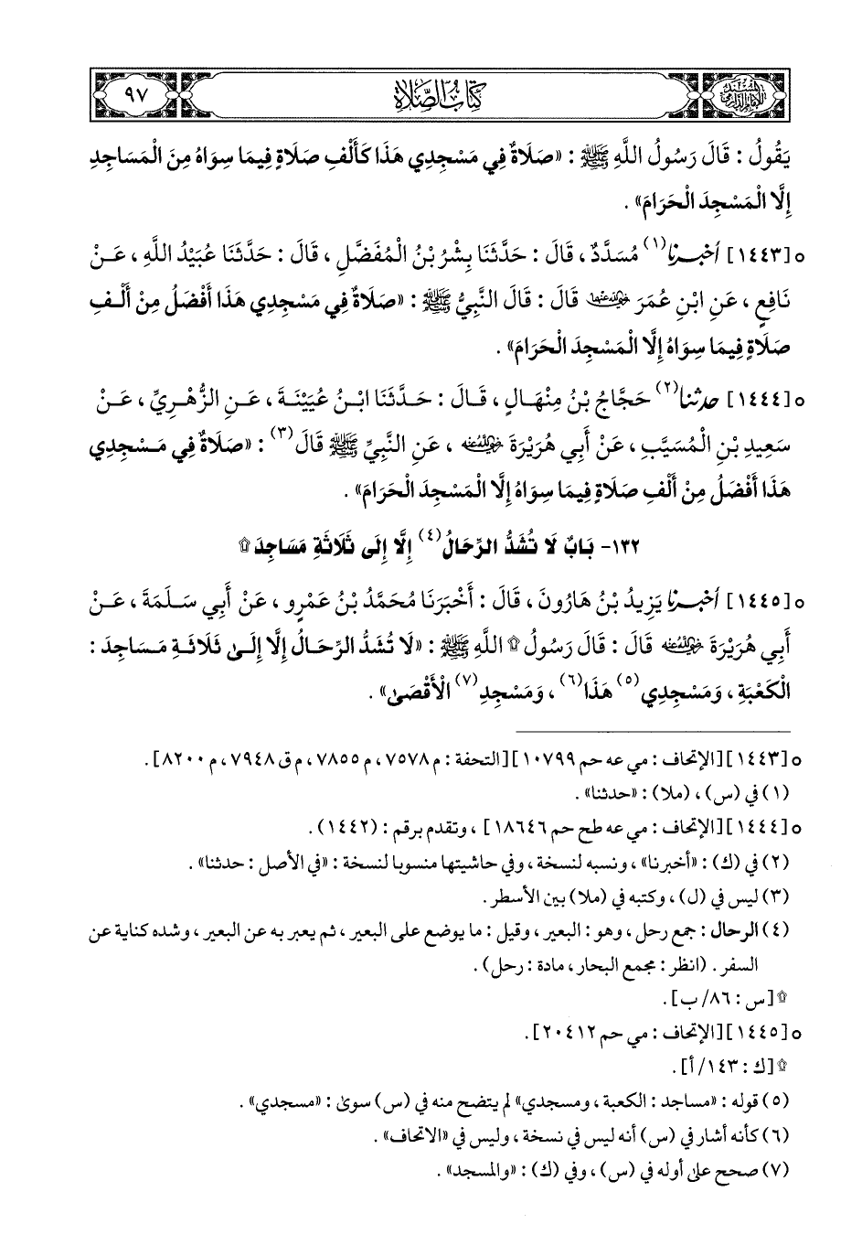 1445- أَخبَرَنا يَزِيدُ بْنُ هَارُونَ, قَالَ: أَخبَرَنا مُحَمَّدُ بْنُ عَمْرٍو, عَنْ أَبِي سَلَمَةَ, عَنْ أَبِي هُرَيْرَةَ رَضِيَ اللهُ عَنْهُ, قَالَ: قَالَ رَسُولُ اللهِ صَلى الله عَليهِ وسَلم: لاَ تُشَدُّ الرِّحَالُ إِلاَّ إِلَى ثَلاَثَةِ مَسَاجِدَ: الْكَعْبَةِ, وَمَسْجِدِي هَذَا, وَمَسْجِدِ (1) الأَقْصَى.