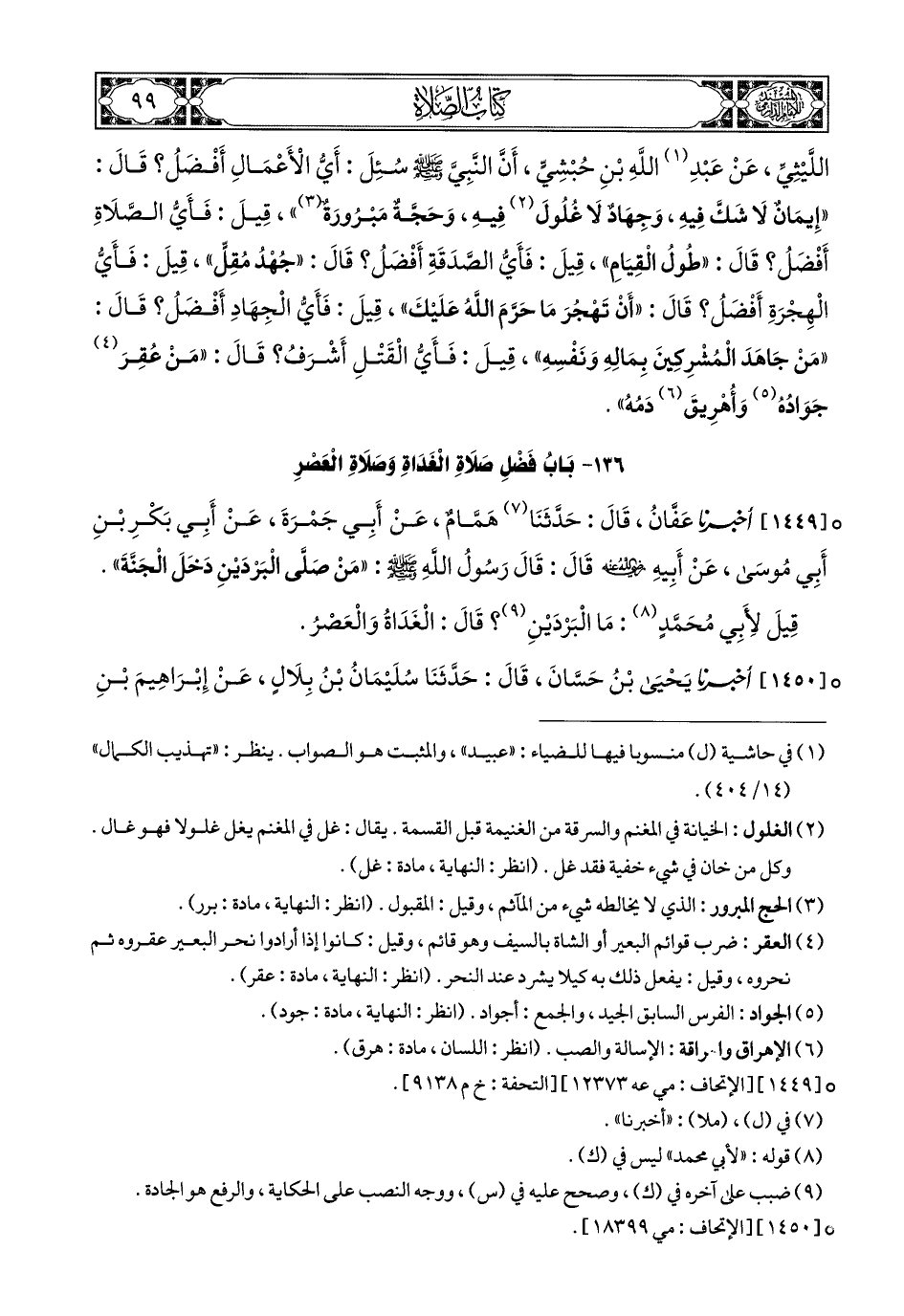 1449- أَخبَرَنا عَفَّانُ, قَالَ: حَدَّثَنَا هَمَّامٌ, عَنْ أَبِي جَمْرَةَ, عَنْ أَبِي بَكْرِ بْنِ أَبِي مُوسَى, عَنْ أَبِيهِ رَضِيَ اللهُ عَنْهُ, قَالَ: قَالَ رَسُولُ اللهِ صَلى الله عَليهِ وسَلم: مَنْ صَلَّى الْبَرْدَيْنِ دَخَلَ الْجَنَّةَ.