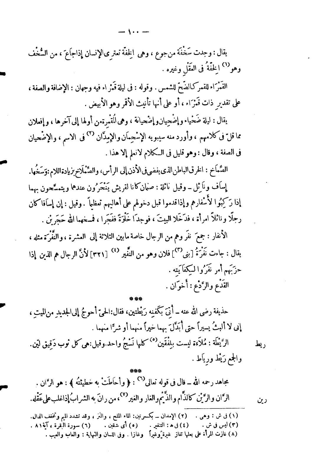 0 - يُقَال: وجدت سخْفَة من جوع وَهِي الخفة تعتري الْإِنْسَان إِذا جَاع من السخف وَهُوَ الخفة فِي الْعقل وَغَيره. القمراء للقمر كالضح للشمس. وَقَوله: فِي لَيْلَة قَمْرَاء فِيهِ وَجْهَان: الْإِضَافَة وَالصّفة على تَقْدِير ذَات قَمْرَاء أَو على إِنَّهَا تَأْنِيث الْأَقْمَر وَهُوَ الْأَبْيَض. يُقَال: لَيْلَة ضحياء وإضحيان وإضحيانة وَهِي المقمرة من أَولهَا إِلَى آخرهَا وإفعلان مِمَّا قل فِي كَلَامهم وَأورد مِنْهُ سِيبَوَيْهٍ الإسحمان والإمدان فِي الِاسْم والإضحيان فى الصّفة وَقَالَ: وَهُوَ قَلِيل فِي الْكَلَام لَا نعلم إِلَّا هَذَا. الصماخ: الْخرق الْبَاطِن الَّذِي يُفْضِي فِي الْأذن إِلَى الرَّأْس والصملاخ بِزِيَادَة اللَّام: وسخها. إساف ونائل وَقيل نائلة: ضَمَان كَانَا لقريش ينحرون عِنْدهمَا ويتمسحون بهما إِذا ركبُوا لأسفارهم وَإِذا قدمُوا قبل دُخُولهمْ على أَهَالِيهمْ تَعْظِيمًا. وَقيل: إِن إسافا كَانَ رجلا ونائلا امْرَأَة فدخلا الْبَيْت فوجدا خلْوَة ففجرا فمسخهما الله حجرين. الأنفار: جمع نفروهم من الرِّجَال خَاصَّة مَا بَين الثَّلَاثَة إِلَى الْعشْرَة والنفرة مثله يُقَال: جَاءَت نفرة [بني] فلَان وَهُوَ من النفير [321] لِأَن الرِّجَال هم الَّذين إِذا حزبهم أَمر نفروا لكفايته. القدع والردع: أَخَوان. حُذَيْفَة رَضِي الله عَنهُ أُتي بكفنه ربطتين فَقَالَ: الْحَيّ أحْوج إِلَى الْجَدِيد من الْمَيِّت إِنِّي لَا ألبث يَسِيرا حَتَّى أُبدل بهما خيرا مِنْهُمَا أَو شرا مِنْهُمَا.